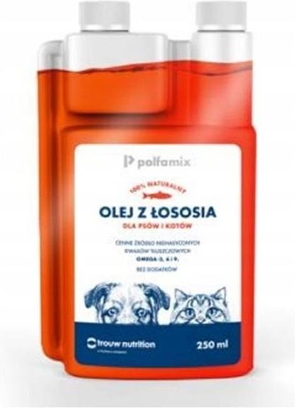 Oleje z łososia dla kota i psa Polfamix 250 ml 100 % naturalny olej z łososia dla Twojego psa lub kota. Olej z łososia Polfamix 250 ml to naturalny olej z ryb dla psów i kotów, będący źródłem nienasyconych kwasów tłuszczowych w tym Omega-3,6 i 9. Olej z łososia dla psów i kotów jest pozyskiwany ze świeżych i nieprzetworzonych ryb. Stosowany jako dodatek do karm spożywanych podawanych zwierzętom. Olej z łososia uatrakcyjnia smak karmy dla psa lub kota, przez co jest ona chętniej spożywana przez zwierzęta. Polecany szczególnie dla psów niejadków i wybrednych kotów. Dlaczego suplementacja diety olejem z łososia jest tak ważna? Poprawia apetyt i pobranie karmy u wybrednych zwierząt. Poprawia jakość i kondycję sierści, zmniejsza intensywność linienia. Wspomaga gojenie ran i ogranicza skutki alergii, Wspiera odporność organizmu, Wspiera prawidłowe działania stawów, utrzymuje w dobrej kondycji szczególnie psy starsze lub intensywnie trenujące. Wspomaga pracę mózgu, co poprawia zdolność uczenia się i zapamiętywania, a także radzenie sobie z emocjami. Pozytywnie wpływa na pracę serca, co ogranicza występowanie chorób serca. Wspiera utrzymania prawidłowego ciśnienia krwi. Przyspiesza regenerację organizmu po wysiłku. Pojemność 250 ml Jak stosować? Olej z łososia stosuje się w żywieniu psów i kotów w każdym wieku. Należy go podawać poprzez zmieszanie z podawaną karmą. Psy ras małych i koty o masie ciała do 10 kg – 5 ml oleju dziennie. Psy ras średnich o masie ciała od 11 kg do 25 kg – 10 ml oleju dziennie. Psy ras dużych o masie ciała powyżej 25 kg – 15 ml oleju dziennie. Polecany przy stosowaniu diety BARF. Produkt dostępny jest w dwóch pojemnościach: 1000 ml i 250 ml
