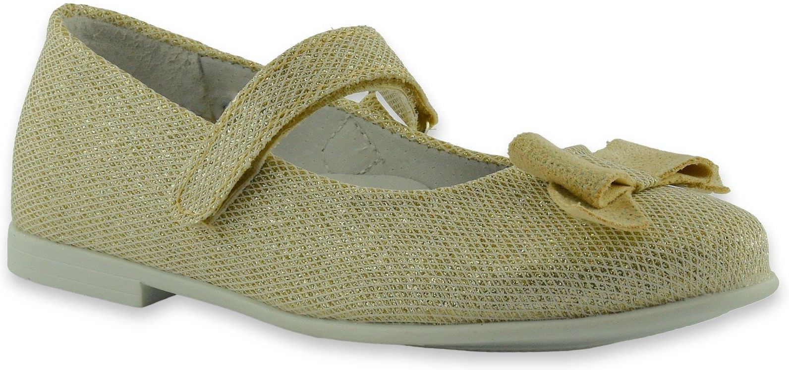Klasyczne, modne balerinki z kokardką na przodzie, zapinane na rzep w pięknym złotym kolorze. Błysku dodaje brokatowy materiał.