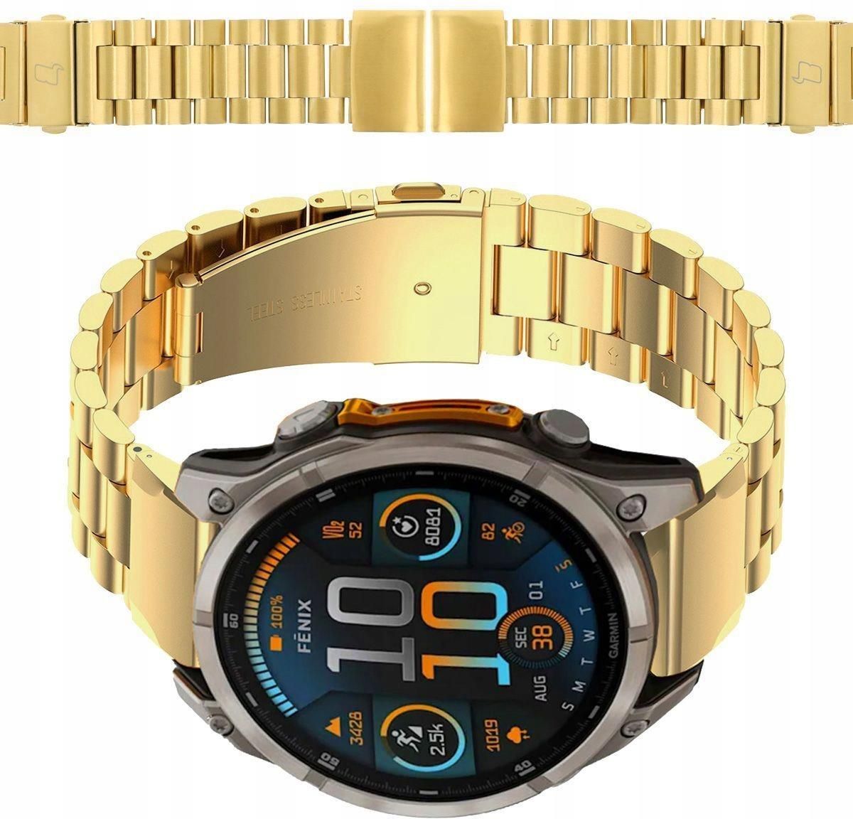 Pasek Bizon Strap Watch Aura Do zegarków kompatybilnych z uniwersalnymi paskami QuickFit o szerokości 22mm* Wersja kolorystyczna: Gold (złota) Materiał: stal nierdzewna Wytrzymała budowa Lśniące wykończenie Zapięcie motylkowe Prosty montaż i demontaż Regulacja długości (narzędzie do wyjmowania ogniw) Zakres obwodu nadgarstka**: 15 - 22,5 cm Przedmiotem sprzedaży jest sam pasek wraz z narzędziem do regulacji, pozostałe akcesoria widoczne na zdjęciach służą jedynie przedstawieniu jego funkcjonalności. Kod produktu: 5904665326879 Kod producenta: BSWAU6922QFGD *Lista kompatybilnych zegarków znajduje się poniżej **Uśredniony zakres, dotyczy standardowego rozmiaru koperty 40 mm Kompatybilność Uniwersalny system montażu QuickFit 22 mm zapewnia szeroką kompatybilność, dzięki czemu pasek pasuje do wielu smartwatchy dostępnych na rynku. Poniżej przedstawiono listę przykładowych kompatybilnych modeli. Garmin Fenix 8 (47 mm) / Fenix E (47 mm) Garmin Fenix 7 / 7 Pro / 6 / 6 Pro / 5 / 5 Plus Garmin Instinct 3 (45 mm) / Instinct E (45 mm) / Instinct Crossover / Instinct 2 / 1 Garmin Quatix 7 Pro / 7 / 6 / 5 Garmin Forerunner 965 / 955 / 945 / 935 / 745 Garmin Epix Pro 2 gen. (47 mm) / Epix 2 Garmin Approach S70 (47 mm) / Approach S62 / S60 Garmin D2 Mach 1 / D2 Delta Garmin MARQ 2 / MARQ 1 Garmin Descent G1 oraz pozostałe modele kompatybilne z systemem mocowania QuickFit 22 mm. Szykowny pasek do zegarka Coś wisi w powietrzu... To pozytywna aura! Bizon Strap Watch Aura to pasek ze stali nierdzewnej, który wręcz emanuje siłą i solidnością. Zaprojektowany z myślą o elegancji i funkcjonalności, idealnie dopasowuje się do każdego nadgarstka, dodając mu majestatycznego charakteru. To akcesorium, które nie tylko pewnie utrzyma pasek na Twoim nadgarstku, ale także przyciągnie wzrok swoim wyjątkowym wyglądem. Długość i szerokość paska Najkrótsze wymiary paska: 16,33 x 2,00 cm Najdłuższe wymiary paska: 19,92 x 2,00 cm (długość — szerokość) Zdjęcie poglądowe, obrazujące sposób mierzenia paska Wytrzymała konstrukcja Wykonany ze wytrzymałej stali nierdzewnej pasek oferuje nie tylko solidność, ale także niezwykłą praktyczność. Chociaż w konkursie na najlżejszą opaskę nie zająłby podium, to z pewnością stanąłby na nim, gdyby chodziło o trwałą i mocną konstrukcję. Bransoletka wyróżnia się eleganckim wyglądem, a odporność na korozję gwarantuje, że zachowa swój blask i nieskazitelny wygląd na długo. Prosta regulacja Bransoletka została wyposażona w tradycyjne zapięcie motylkowe, które jest delikatne dla skóry i dyskretne, co sprawia, że opaska wygląda elegancko i harmonijnie. Pasek nie zaburza funkcjonalności smartwatcha, a sam montaż nie sprawi Ci większych problemów — wystarczy, że wepniesz łączenia do koperty zegarka i gotowe! Dołączone do zestawu narzędzie do regulacji umożliwi Ci idealne dopasowanie rozmiaru bransoletki do Twojego nadgarstka, a instrukcję, jak to zrobić znajdziesz na dole aukcji. Na miarę Twojego nadgarstka Nie wiesz, czy pasek będzie pasował? Sprawdź, jak wygląda na różnych rozmiarach nadgarstka! Dzięki możliwości regulacji, możesz dopasować go do każdego nadgarstka, tego małego i dużego! 1: Pasek na nadgarstku o obwodzie 15 cm 2: Pasek na nadgarstku o obwodzie 18 cm 3: Pasek na nadgarstku o obwodzie 20 cm Zdjęcia mają charakter poglądowy i ilustrują, jak pasek układa się na różnych rozmiarach nadgarstków. Do sesji użyto smartwatcha o kopercie 40 mm.