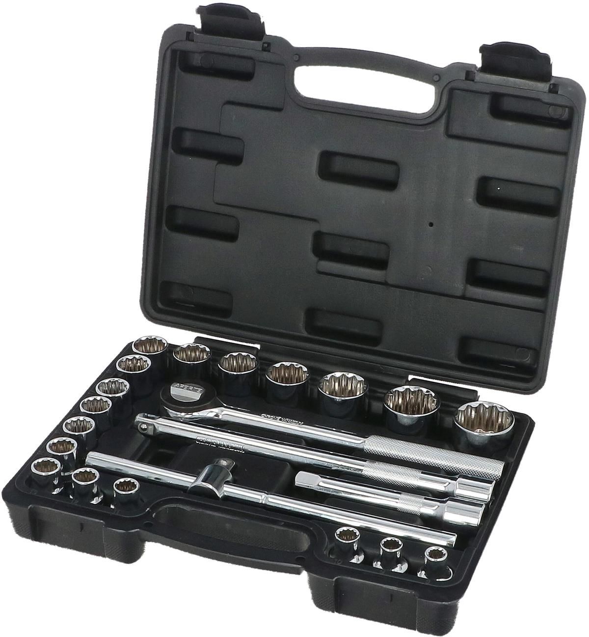 W zestawie znajdują się następujące elementy: ROZMIAR 1/2" nasadki dwunastokątne: 8, 9, 10, 11, 12, 13, 14, 15, 16, 17, 18, 19, 21, 22, 24, 27, 30, 32 mm przedłużka: 10"(250 mm), 5" (125 mm) rękojeść przesuwna T 1/2" 250 mm rękojeść z grzechotką 1/2"