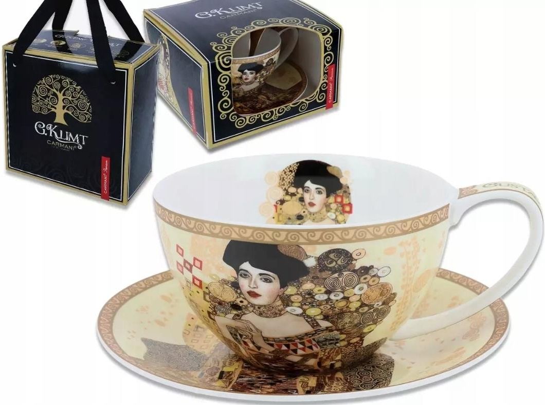 Filiżanka o dość dużej pojemności, poręczna, porcelanowa ze spodeczkiem, atrakcyjna jako upominek dla kolekcjonera i miłośnika twórczości Gustava Klimta. Produkt o wyraźnym, bez złoceń, kolorowym motywie na swojej powierzchni w postaci naniesionej reprodukcji obrazu Gustava Klimta (ur. 14 lipca 1862 roku w Baumgarten, zm. 6 lutego 1918 w Wiedniu – austriacki malarz i grafik, symbolista. Jeden z najwybitniejszych przedstawicieli secesji, przywódca wiedeńskiego modernizmu, autor m.in.: "The Kiss"; "Lady with Fan"; "Adele Bloch - Bauer"). Filiżanka firmowana jest znaną i niezwykle cenioną marką Carmani, co jest gwarancją jakości zastosowanej do jej wyrobu porcelany. Z kilku takich filiżanek można stworzyć bardzo atrakcyjny serwis do podawania kawy lub herbaty. Dzięki oryginalnemu kształtowi, jakości oraz wykonaniu Ty i goście na pewno będą oczarowani Zwracamy uwagę, że dzięki kostnej porcelanie kawa/herbata będzie miała szansę ujawnić swój prawdziwy smak oraz aromat. Powodem tego jest fakt, że porcelana kostna bardzo dobrze utrzymuje ciepło, a to wpływa z kolei na fakt, że kawa(i każdy, inny gorący napój) zachowa swoją temperaturę i aromat na dłużej. Specyfikacja: Wzór: Adela (kremowy) Wysokość filiżanki = około 7cm Średnica filiżanki = około 5/11cm(dół/góra) Pojemność filiżanki = około 360ml Średnica spodeczka = około 16cm Porcelana: kostna, biała i lekka, dobrej jakości t. "New Bone China" (nieco grubsza od tradycyjnej, kostnej "Fine Bone China") Motyw: trwale naniesiony, bez złoceń Użytkowanie: można myć w zmywarkach (choć osobiście zalecamy mycie ręczne) Sposób pakowania: kartonowe, upominkowe