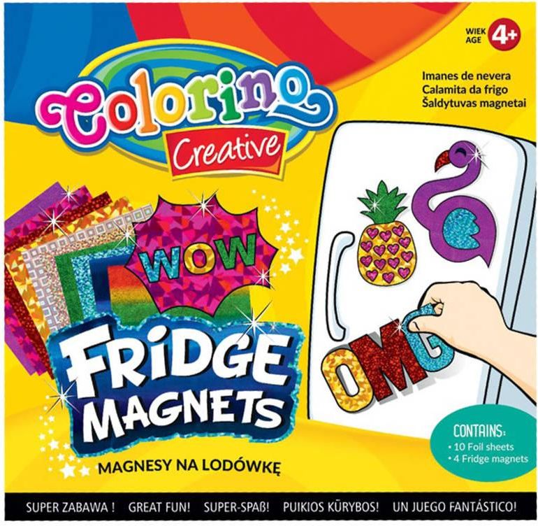 Stwórz indywidualne, multikolorowe błyszczące magnesy dla siebie lub przyjaciół. Zawartość: 10 sztuk kolorowej folii, 4 magnesy. Jak tworzyć: usuń biały papier z magnesu, połóż folię kolorową częścią do góry na magnes z warstwą kleju, dociśnij folię do magnesu, usuń pozostałą folię, powtórz czynność z innymi kolorami. Magnes gotowy! Wysyłamy jeden z dostępnych wzorów Kraj produkcji: PL