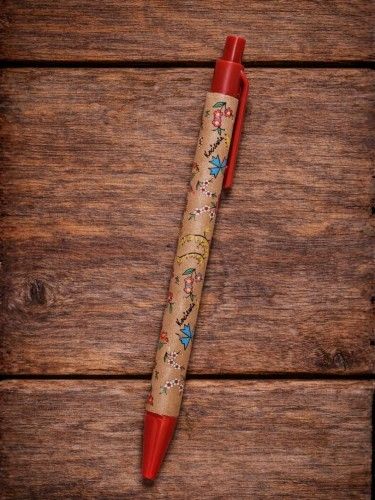 Długopis ze wzorem kociewskim Plastikowy długopis ze wzorem haftu kociewskiego. Niebieski wkład. Piękny, kolorowy wzór uprzyjemni pracę w domu, biurze i szkole. Długość: 13,5 cm Cena dotyczy jednej sztuki. Wyprodukowano na Pomorzu.