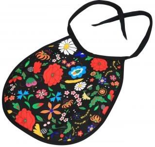 Śliniaczek kociewski, czarny Śliniaczek dziecięcy zdobiony wzorami haftu kociewskiego. Wykonany jest z delikatnej, nieprzemakalnej tkaniny. Wewnątrz obszyty delikatną fizeliną. Starannie wykończony czarną lamówką. Wiązany na szyjce niemowląt oraz większych dzieci. Wymiary: szerokość: 24 cm długość: 28 cm Wyprodukowano na Pomorzu.