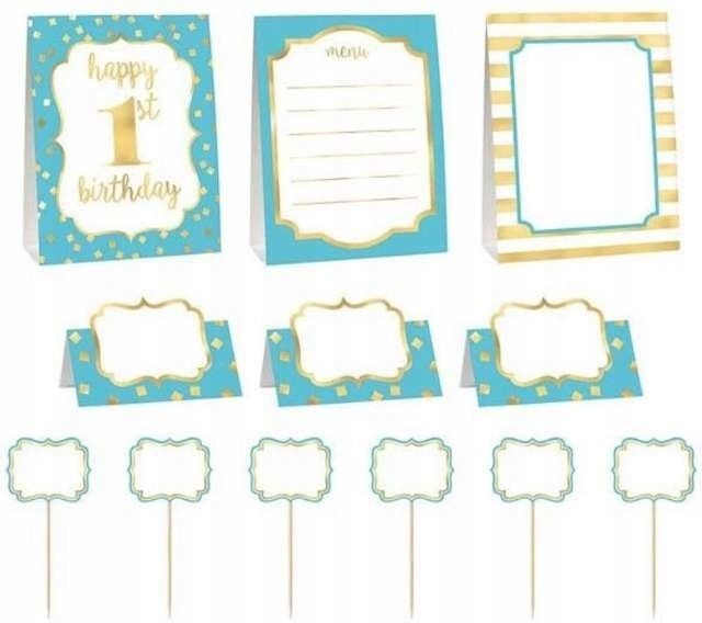 Zestaw dekoracyjny na 1. urodziny – niebiesko-złoty motyw Planujesz niezapomniane 1. urodziny swojego maluszka? Ten uroczy zestaw dekoracyjny w kolorach niebieskim, białym i złotym będzie idealnym dodatkiem do przyjęcia! Elegancki, a jednocześnie radosny styl nada wyjątkowego klimatu każdemu stołowi i zachwyci gości! W skład zestawu wchodzą Wizytówki Wymiary: Wysokość: 7 cm Szerokość: 10 cm. Pikery Tekturki na długiej drewnianej wykałaczce. Posiada białe miejsce na wypisanie tekstu na obu stronach. Wymiary: Wysokość: 6,5 cm Szerokość: 8 cm Wysokość całkowita: 18,5 cm. Karty Składane, stoją samodzielnie. Każda karta ma inny kolor ramki i wzór. Wymiary: Wysokość: 22 cm Szerokość: 17 cm Szerokość podstawy: 7,5 cm. Zalety Stylowy design w odcieniach błękitu i złota Możliwość własnoręcznego podpisania elementów Uniwersalne zastosowanie – do dekoracji stołu, bufetu, ciast czy prezentów Świetny dodatek do sesji zdjęciowej Idealny na Pierwsze urodziny chłopca lub dziewczynki Imprezy rodzinne Przyjęcia tematyczne Dekorację stołu lub candy baru Stwórz wyjątkową oprawę pierwszych urodzin – ten zestaw pomoże Ci zadbać o każdy szczegół!