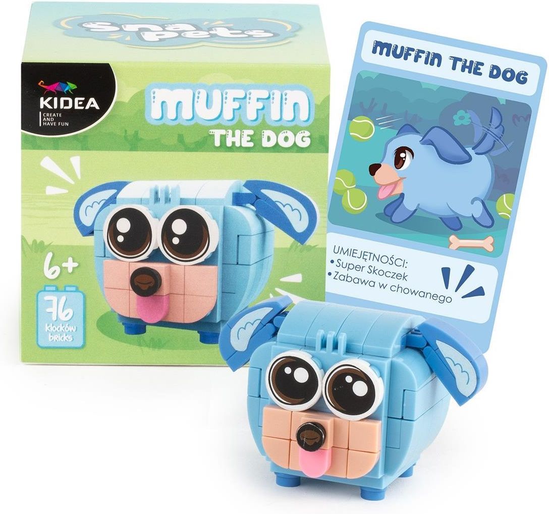Snapets Klocki konstrukcyjne 76 elementów Pies niebieski Muffin Kidea Zbuduj własnego Snapetsa i odkryj świat pełen zabawy, przygód i kreatywności! Muffin to radosny i lojalny psiak, który uwielbia psoty i zabawę w chowanego. Potrafi jednym skokiem przeskoczyć na drugi brzeg rzeki albo wskoczyć do …