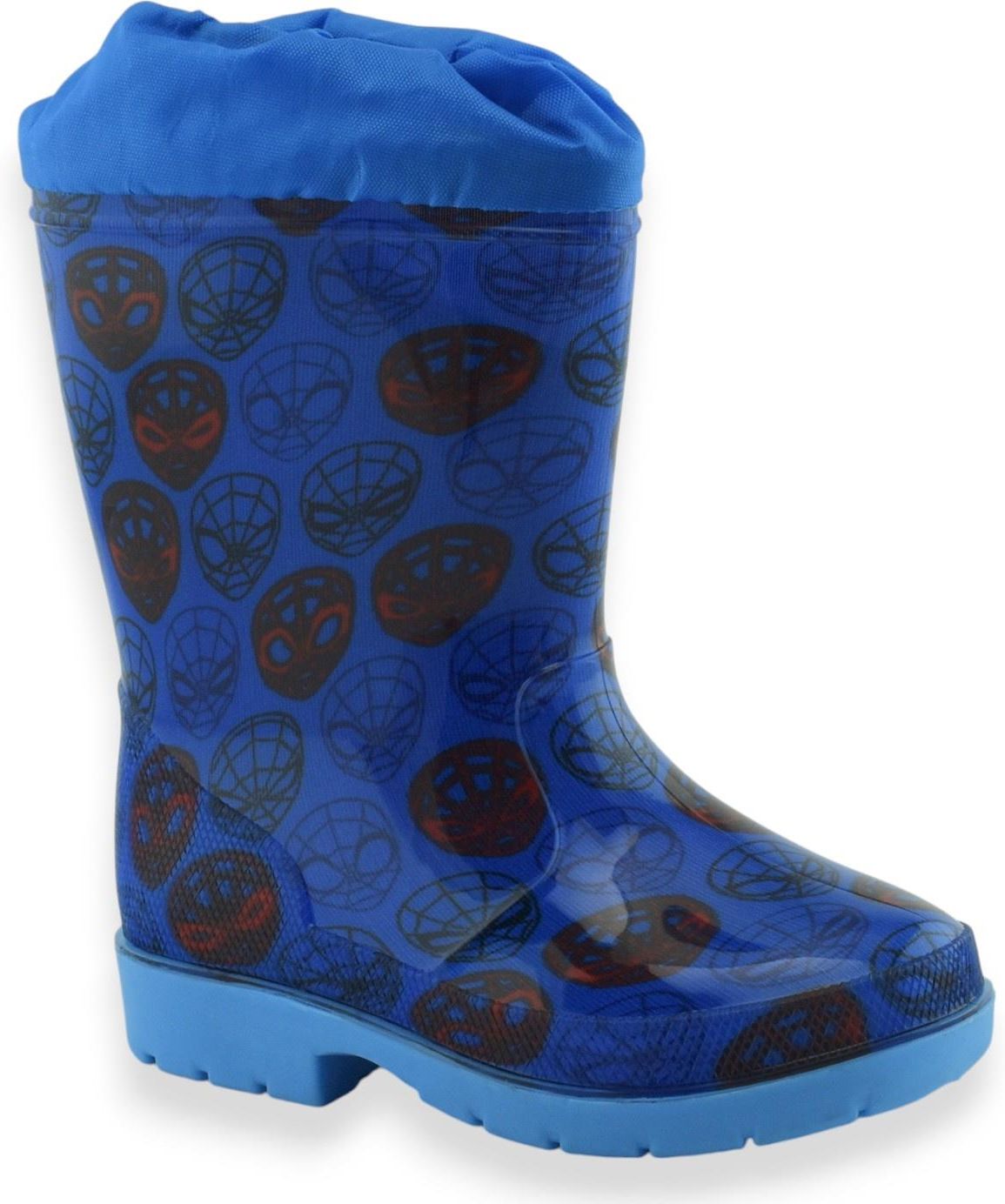 Chłopięce kalosze w niebieskim kolorze z motywem Spider-Mana. Zakończone praktycznym ściągaczem, który zapobiega przedostawaniu się wody i błota do wnętrza. Doskonałe na wiosenne i letnie dni, idealne na deszczową pogodę oraz leśne spacery.