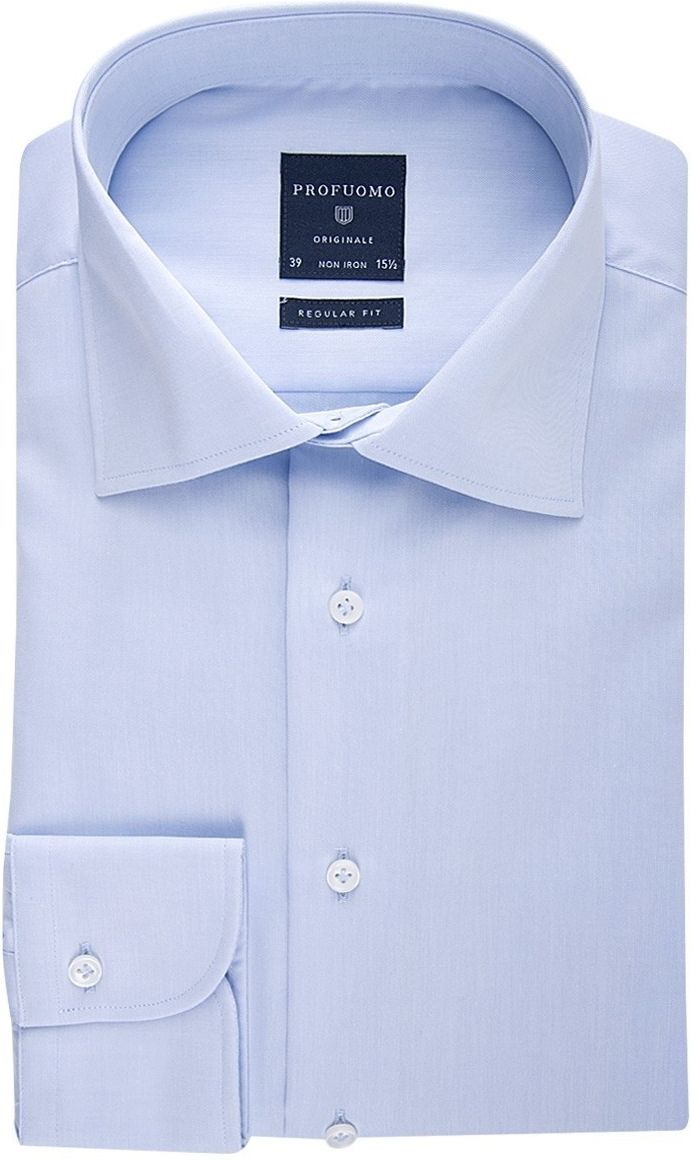 Elegancka błękitna klasyczna koszula męska (Normal Fit) z półwłoskim kołnierzykiem i mankietami na guziki. Uszyta z bawełny w 100% z wykończeniem non iron. Guziki przyszyte w tzw kurzą stopkę. Koszula uszyta jest z klasycznej lekkiej tkaniny o splocie fine twill. Jest gładka zwarta tkanina. Koszule męskie Profuomo to typowy włoski styl i dbałość o każdy detal wykończenia koszuli. Idealna jako elegancka koszula biznesowa lub wizytowa.