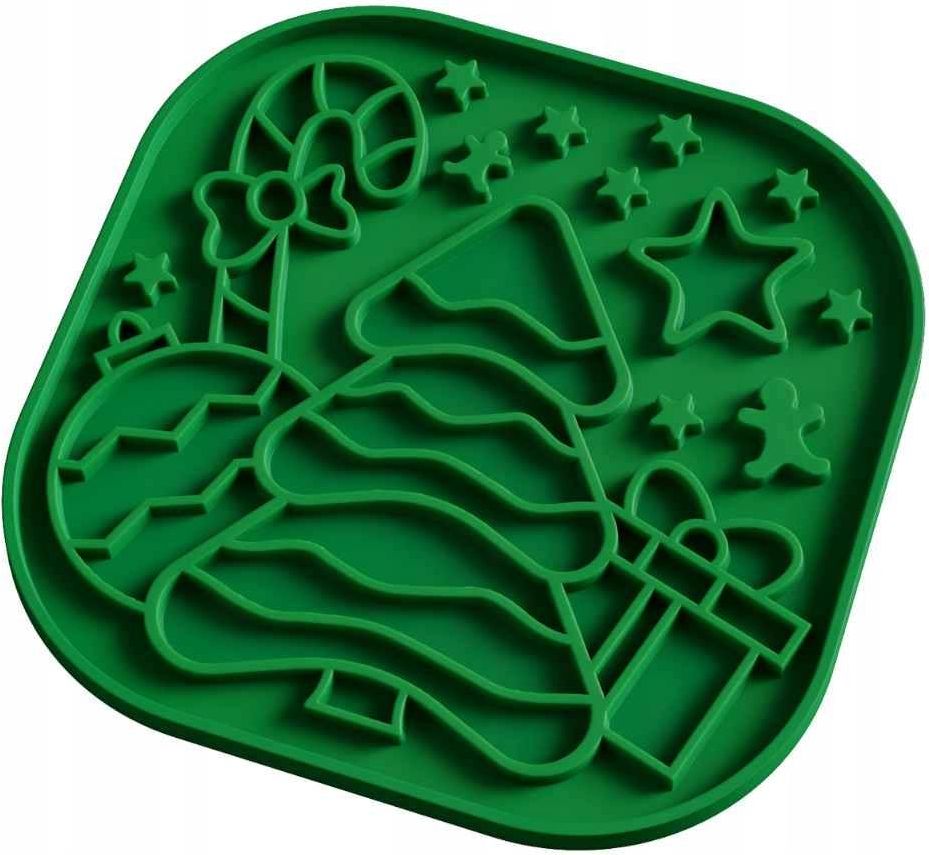 Mata do lizania ze świątecznym wzorem w kolorze zielonym – lickmata dla PsaBehawioryści oraz lekarze weterynarii polecają stosowanie mat do lizania, które pobudzają wiele zmysłów naraz, zapewniając pupilowi zajęcie i odstresowanie. Spowalnianie jedzenia ma również zbawienny wpływ na układ trawienny, zapobiega między innymi skrętowi żołądka i innym problemom gastrycznym. Wykonana z materiału TPE-S mata do lizania to idealny wybór kiedy chcemy „zmęczyć” umysłowo pupila. Jest miękka i pełna rowków z wypustkami, które podczas lizania działają oczyszczająco na język, wspierając higienę jamy ustnej oraz powolne, zdrowe jedzenie. Nasza Lickmata jest w 100% wykonana w Polsce. To bardzo ważne, nie kupuj chińskich odpowiedników, uważaj na azjatyckie produkty do kontaktu z żywnością. Pełne szkodliwych substancji, w kontakcie z żywnością, stanowią rakotwórcze zagrożenie dla życia i zdrowia Twojego Psa. Produkty od Fiboo nie tylko są wolne od szkodliwych substancji, a dodatkowo są ekologiczne i nadają się do ponownego przetworzenia.Zalety podawania posiłków na Lickmacie od Fiboo:– Utrzymuje na dłużej zainteresowanie i zaangażowanie pupila,– Sprawia radość ze zdobywania smakołyku oraz nie przekarmia, gdyż wspiera powolne pobieranie pokarmu,– Powtarzające się lizanie stymuluje produkcję śliny i pobudza apetyt – to idealny gadżet dla niejadków,– Lizanie to także czynność, która działa uspokajająco – spróbuj złagodzić stres wywołany wizytą u weterynarza lub podróżą– matę można mrozić co doskonale sprawdzi się na letnie upały pozwalając psiakowi schłodzić sięW 100% nadaje się do ponownego przetworzenia!Wymiary:– Długość: 19cm– Szerokość: 19cm Lickmata ma uniwersalne wymiary, ten rozmiar nada się dla małego, średniego i dużego Psa. Mata dostępna także w czerwonej wersji kolorystycznej. Mata do lizania ze świątecznym wzorem w kolorze zielonym to praktyczny gadżet dla psa, który łączy zabawę z korzyściami zdrowotnymi. Wykonana z bezpiecznego, recyklingowalnego materiału TPE-S, wspomaga higienę jamy ustnej, spowalnia jedzenie, redukuje stres i stymuluje umysł pupila. Produkt w 100% polski, wolny od szkodliwych substancji, idealny dla psów niejadków i do schładzania w upalne dni. Elegancki design czyni ją doskonałym wyborem na świąteczny prezent. Fiboo Lollipop Xmas Mata do Lizania Świąteczna