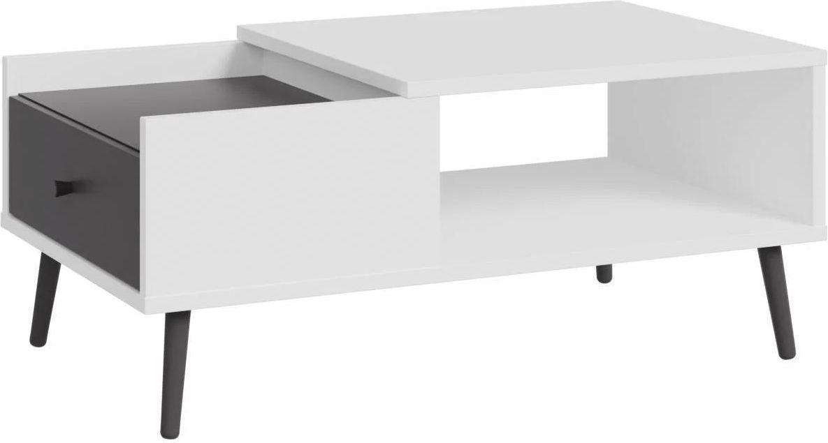 Stolik okolicznościowy HARLLSON w zestawieniu bieli z kolorem Uni Wolfram Szary to propozycja dla osób, które lubią wyraźniejszy, nowoczesny charakter wnętrza. Jasne fronty rozświetlają przestrzeń, a szary akcent dodaje całości elegancji i lekkiego „loftowego” sznytu. Prosta forma i smukłe nóżki sprawiają, że stolik wygląda lekko, a jednocześnie prezentuje się bardzo stabilnie i estetycznie w centralnej części salonu. Taka kolorystyka świetnie podkreśla nowoczesne dodatki i pozwala budować aranżację na zasadzie kontrastu. Funkcjonalne przechowywanie bez chaosu Na co dzień docenisz wygodne rozwiązania do przechowywania. Szuflada pozwala schować piloty, słuchawki, ładowarki czy notatnik, a otwarta półka pod blatem ułatwia odkładanie rzeczy, do których chcesz mieć szybki dostęp. Dzięki temu stolik pomaga utrzymać porządek w strefie relaksu i sprawia, że blat pozostaje czysty oraz gotowy na kawę, przekąski czy dekoracje. Ława kawowa do wnętrz minimalistycznych i loft Kolorystyka biało-szara świetnie łączy się z czarnymi dodatkami, szkłem, metalem i jasnym drewnem, dlatego stolik łatwo dopasować do wielu aranżacji. Sprawdzi się zarówno w minimalistycznym salonie, jak i w bardziej industrialnym klimacie, gdzie liczy się kontrast i prostota. Ława do salonu biały + Uni Wolfram Szary będzie dobrym wyborem, jeśli chcesz mieć praktyczny mebel, który wygląda nowocześnie i nie narzuca stylu całemu wnętrzu. Wymiary Szerokość: 106 cm Głębokość: 59,8 cm Wysokość: 45,4 cm