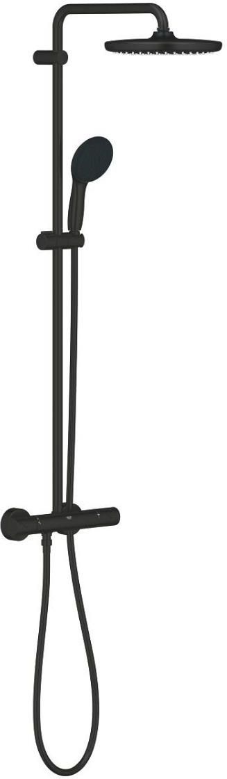 Grohe Tempesta System 250 system prysznicowy z termostatem do montażu ściennego 266702431 elementy składowe: poziome obrotowe ramię 390 mm termostat natynkowy z funkcją Aquadimmer przełącznik: deszczownica/ prysznic ręczny head shower Tempesta 250 rodzaj strumienia: strumień Rain deszczownica z czarną tarczą z przegubem kulowym kąt obrotu ± 10° hand shower Tempesta 110 2 rodzaje strumienia Rain, Jet regulowany uchwyt prysznica shower hose 1750 mm 1/2" x 1/2" (28 388) GROHE Water Saving mniejsze zużycie wody maximum flow rate (at 3 bar): 7.3 l/min GROHE TurboStat głowica termostatyczna GROHE SafeStop blokada na 38°C GROHE SafeStop Plus w zestawie opcjonalny ogranicznik temperatury 43°C GROHE SmartSwitch intuicyjny i łatwy przełącznik ułatwia wybór preferowanego strumienia wody GROHE DreamSpray perfekcyjny natrysk ShockProof silikonowy pierścień chroniący słuchawkę w razie upadku GROHE Long-Life trwała powłoka SpeedClean system przeciw osadom wapiennym wewnętrzny kanał wodny TwistStop system zapobiegający skręcaniu węża prysznicowego przystosowany do podgrzewaczy przepływowych o mocy min. 18 kW min. przepływ 7 l/min. wyposażenie opcjonalne: GROHE EasyReach półka (26 362 LN0); zamawiana osobno Wariant produktu: Professional Kolor: czarny matowy matte black Kod producenta: 266702431 Kod EAN: 4067393015970