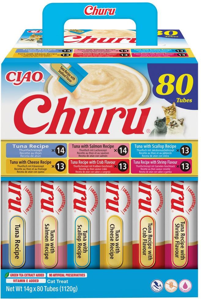 Inaba Cat Churu 80x14g (1120g) Kremowy Przysmak Dla Kota Pasta Mix z Tuńczykiem Niewiarygodnie smaczne i zdrowe przekąski produkowane z najwyższej jakości składników „human grade” czyli jakości jak dla ludzi. Unikalne kremowe smakołyki Churu dla kotów prosto z Japonii. Churu są niskokaloryczne, nie zawierają zbóż i konserwantów, są produkowane z mięsa pochodzącego od kurczaków z wolnego wybiegu, naturalnie hodowanych na ściśle nadzorowanych fermach oraz z tuńczyka dalekomorskiego odławianego w sposób zrównoważony i certyfikowany i bezpieczny dla delfinów. Opakowanie jest zaprojektowane w specjalny sposób, żebyś mógł karmić kota z ręki dzięki czemu Wasza więź zacieśni się jeszcze bardziej. • Tuńczyk jest zawsze pierwszym składnikiem • Nie zawierają zbóż, konserwantów i sztucznych barwników • Kremowa, wilgotna tekstura uwielbiana przez wszystkie koty • Churu to dodatkowa porcja wody dla kotów mało pijących • Przysmaki Churu mają zaledwie 1/10 kalorii zawartych w suchych przekąskach