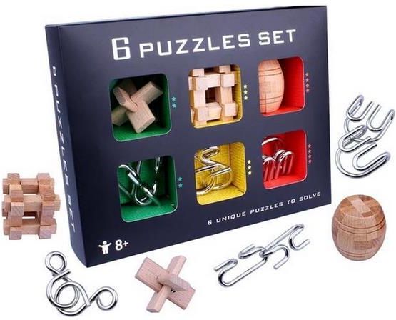 Zestaw łamigłówek logicznych 6 szt. 6 najlepszych łamigłówek w jednym opakowaniu Łamigłówki pobudzające szare komórki Świetny pomysł na urozmaicenie czasu Rozwiązuj je w drodze do pracy, w kolejce do lekarza i gdziekolwiek zechcesz Dzięki niewielkim rozmiarom możesz je schować do kieszeni Oryginalny prezent na urodziny lub Święta