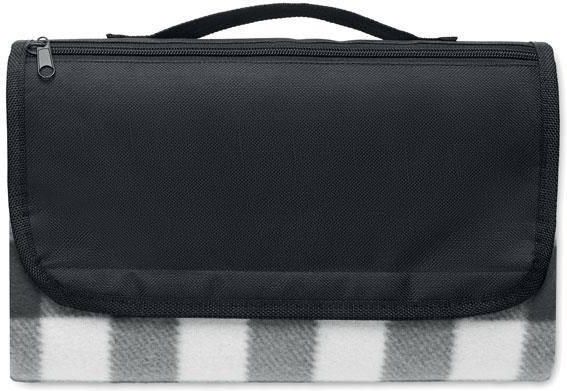 Składany koc piknikowy z polaru RPET 150 gr/m² z wodoodporną powłoką PEVA na jednej stronie. Zawiera przednią kieszeń na suwak i krótki pasek do przenoszenia.