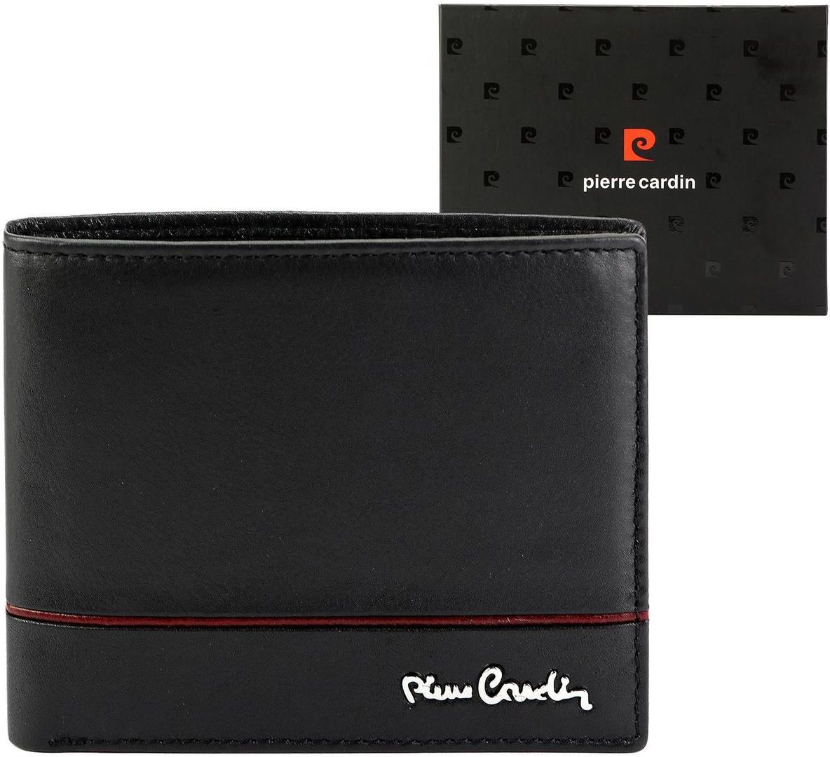 Elegancki portfel męski Pierre Cardin YS605 324 RFID - czerwony Prezentowany portfel z pewnością zachwyci miłośników klasycznych dodatków galanteryjnych, wykonanych z wysokiej jakości materiałów. Francuska marka Pierre Cardin od lat stanowi ikonę stylu i elegancki, której nikomu nie trzeba przedstawiać. Pojemny portfel męski ozdobiony paskiem Prezentowany portfel to model klasyczny, do którego dodano element nietuzinkowy, czyli przeszycie na zewnętrznej stronie portfela. Można wybrać jedną z dwóch opcji: portfel czarny z czerwonym paskiem lub wersję z dodatkiem w kolorze czarnym. Obie wersje są bardzo eleganckie. Okładkę dodatkowo ozdabia charakterystyczne metalowe logo marki Pierre Cardin. Portfel jest bardzo wygodny i ładnie układa się w dłoni. Ma orientację poziomą i wymiary 9,5 cm x 12 cm. Dzięki funkcjonalnemu rozmieszczeniu kieszonek pomieści wszystkie ważne dokumenty i karty oraz najpotrzebniejszą gotówkę. Posiada: kieszonkę na monety zamykaną na zatrzask, 2 przegrody na banknoty, 9 miejsc na karty (jedno z nich jest osiatkowane, idealne na zdjęcie lub dowód osobisty) i 3 dodatkowe kieszenie na dokumenty, w tym dwie osiatkowane. Portfel posiada również RFID, blokujące możliwość zdalnego odczytu i kopiowania danych z kart i dokumentów. Warto zainwestować w tę technologię i chronić dane przed zdalną kradzieżą! Prezent dla mężczyzny Skórzany portfel będzie wspaniałym prezentem dla stylowego mężczyzny, który jest Ci bliski i któremu chcesz sprawić niespodziankę. Portfel jest dodatkiem potrzebnym zawsze, więc na pewno okaże się upominkiem przydatnym. Z kolei jego piękny wygląd będzie cieszył oko noszącego. Portfel znajduje się w oryginalnym pudełku z logo producenta, dzięki czemu całość prezentuje się oryginalnie. https://www.galante.pl/app/uploads/2025/08/bl_1-23.jpg