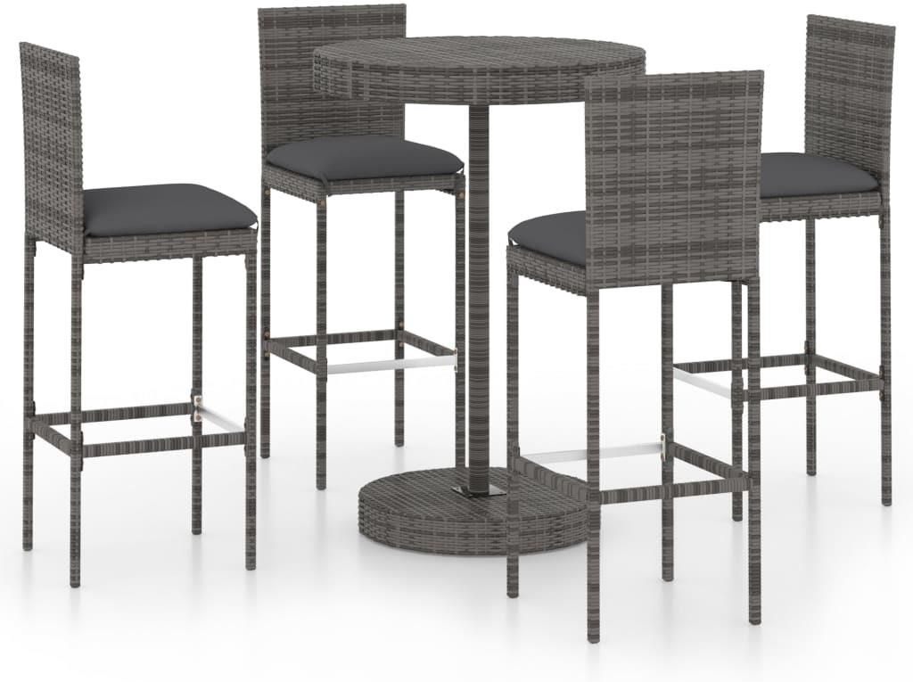 Ten stylowy zestaw mebli barowych do ogrodu zapewni Ci spokój i wygodę w czasie spędzonym z rodziną i przyjaciółmi. Stół barowy wspiera się na ramie ze stali malowanej proszkowo, dzięki czemu jest stabilny i wytrzymały. Okrągły blat idealnie nadaje się do umieszczania napojów, jedzenia lub przedmiotów dekoracyjnych. Stołki mają stalową ramę o mocnej konstrukcji i wykonane są z odpornego na czynniki atmosferyczne rattanu PE, co oferuje stabilność i łatwość przenoszenia. Poduszka i podnóżek zapewniają również większy komfort siedzenia na stołku. Poliestrowa poszewka na poduszkę z ukrytym zamkiem błyskawicznym ułatwia utrzymanie czystości. Kolor: szary Materiał: rattan PE, malowana proszkowo stal Materiał poduszki: tkanina (100% poliester) Wymiary stołu: 75,5 x 106 cm (śr. x wys.) Wymiary krzesła: 40 x 44 x 108 cm (szer. x gł. x wys.) Wysokość siedziska nad ziemią: 76 cm Grubość poduszki: 4 cm Wymagany montaż: tak Zawartość przesyłki: 1 x stolik barowy 4 x stołek barowy 4 x poduszka na siedzisko