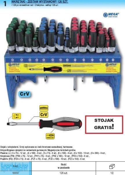 Wkrętaki Jeżyki zestaw wystawowy 126 elementów Mega 10050 Zestaw wkrętaków "Jeżyki" MEGA 10050 to 126 sztuk narzędzi ze stojakiem. Groty ze stali chromowo-wanadowej z magnetycznymi końcówkami i antypoślizgowe rękojeści zapewniają trwałość i komfort. Idealny do kompleksowych prac domowych, od montażu mebli po drobne naprawy, przyspiesza pracę w każdym gospodarstwie domowym. WKRĘTAKI JEŻYKI ZESTAW 126 SZTUK MEGA 10050 Zestaw wkrętaków "Jeżyki" MEGA 10050 to kompleksowe rozwiązanie do wszelkich prac montażowych i demontażowych w domu, oferujące szeroki wybór narzędzi w jednym wygodnym stojaku. Zestaw składa się ze 126 sztuk różnorodnych wkrętaków, wyposażonych w groty wykonane ze stali chromowo-wanadowej oraz magnetyczne końcówki, co zapewnia trwałość i ułatwia precyzyjne operowanie śrubami. Antypoślizgowe rękojeści z gumowymi wstawkami gwarantują komfort pracy. Ten zestaw, idealny do domowych, okazjonalnych zastosowań, znacząco przyspiesza i ułatwia szybkie skręcanie i rozkręcanie, co jest kluczowe podczas doraźnych napraw i montażu. Budowa i właściwości użytkowe Zestaw wkrętaków "Jeżyki" MEGA 10050 to imponująca kolekcja 126 sztuk narzędzi, zaprojektowana z myślą o kompleksowym pokryciu potrzeb w zakresie wkręcania i wykręcania. Centralnym elementem zestawu jest stojak na wkrętaki, który ułatwia przechowywanie, organizację i szybki dostęp do wybranego narzędzia, co jest szczególnie cenne w domowym warsztacie. Wszystkie wkrętaki posiadają antypoślizgowe rękojeści ze wstawkami gumowymi. Połączenie twardego tworzywa z miękkimi, gumowymi elementami zapewnia pewny chwyt, zmniejszając ryzyko wyślizgnięcia się narzędzia z dłoni i zwiększając komfort pracy, nawet podczas długotrwałych czynności. Groty wszystkich wkrętaków wykonane są ze stali chromowo-wanadowej. Materiał ten jest popularny w produkcji narzędzi ze względu na swoją odporność na odkształcenia i pękanie, co przekłada się na długą żywotność i niezawodność. Dodatkowo, groty posiadają magnetyczne końcówki, które ułatwiają podnoszenie i precyzyjne pozycjonowanie śrub, zapobiegając ich zgubieniu w trudno dostępnych miejscach. Zestaw zawiera szeroki wybór grotów, w tym: Groty Krzyżowe Phillips: PH0 x 75 mm (12 sztuk), PH1 x 75 mm (8 sztuk), PH2 x 100 mm (10 sztuk), PH3 x 150 mm (8 sztuk). Te rozmiary pokrywają najczęściej spotykane śruby krzyżowe. Groty Krzyżowe Pozidriv: PZ0 x 75 mm (8 sztuk), PZ1 x 75 mm (8 sztuk), PZ2 x 100 mm (10 sztuk), PZ3 x 150 mm (8 sztuk). Typ Pozidriv oferuje lepsze przenoszenie momentu obrotowego i mniejsze ryzyko wyślizgnięcia się z gniazda śruby. Groty Płaskie: 3x75 mm (12 sztuk), 4x100 mm (8 sztuk), 5x75 mm (8 sztuk), 6x100 mm (8 sztuk), 6x150 mm (10 sztuk), 8x200 mm (8 sztuk). Różnorodność rozmiarów i długości pozwala na dopasowanie wkrętaka do każdej śruby płaskiej, od małych, precyzyjnych prac po większe zadania wymagające dłuższego zasięgu. Produkty marki MEGA są idealne do domowych, okazjonalnych zastosowań, oferując pełną użyteczność i spełniając wymogi wytrzymałościowe przewidziane dla narzędzi stosowanych do doraźnych napraw i remontów. Ten zestaw jest przykładem narzędzia, które za pośrednictwem swojej prostoty i funkcjonalności umożliwia szybką realizację prac. Praktyczne korzyści dla użytkownika Zestaw wkrętaków "Jeżyki" MEGA 10050 to kompleksowe wyposażenie dla każdego gospodarstwa domowego. Dzięki szerokiej gamie rozmiarów i typów grotów, użytkownik jest przygotowany na niemal każde zadanie montażowe i demontażowe. Stojak na wkrętaki zapewnia porządek i łatwy dostęp do narzędzi, eliminując problem szukania odpowiedniego wkrętaka. Antypoślizgowe rękojeści i magnetyczne końcówki zwiększają komfort i precyzję pracy, minimalizując zmęczenie i ryzyko zgubienia śrub. Ten zestaw przyspiesza i ułatwia codzienne prace, od skręcania mebli, przez naprawy sprzętu, po drobne majsterkowanie. Jest to narzędzie, które zapewnia dostępność, trwałość oraz jakość dostosowaną do potrzeb amatorów, pozwalając na szybsze i bardziej efektywne wykonanie zadań. Zalety produktu Kompleksowy zestaw: 126 sztuk wkrętaków o różnorodnych rozmiarach i typach. Organizacyjny stojak: Ułatwia przechowywanie i dostęp do narzędzi. Trwałe groty: Wykonane ze stali chromowo-wanadowej. Magnetyczne końcówki: Ułatwiają operowanie śrubami. Komfort pracy: Antypoślizgowe rękojeści z gumowymi wstawkami. Uniwersalność: Szeroki zakres zastosowań w domu i warsztacie. Parametry techniczne Ilość: 126 szt. – Duża liczba 126 wkrętaków zapewnia szeroki zakres rozmiarów i typów grotów, co umożliwia użytkownikowi wykonanie praktycznie każdej pracy wymagającej wkrętaka w domu, bez konieczności dokupowania pojedynczych narzędzi. Stojak z wkrętakami – Stojak na wkrętaki pozwala na łatwe przechowywanie i organizację narzędzi, co ułatwia szybkie odnalezienie potrzebnego wkrętaka i utrzymanie porządku w miejscu pracy. Antypoślizgowe rękojeści ze wstawkami gumowymi – Antypoślizgowe rękojeści z gumowymi wstawkami zapewniają pewny i komfortowy chwyt, zmniejszając zmęczenie dłoni i ryzyko wyślizgnięcia się narzędzia, co zwiększa bezpieczeństwo i precyzję pracy. Groty wykonane ze stali chromowo-wanadowej – Użycie stali chromowo-wanadowej do produkcji grotów gwarantuje ich wysoką wytrzymałość i odporność na odkształcenia i zużycie, co przekłada się na długą żywotność narzędzia i jego niezawodność. Magnetyczne końcówki grotów – Magnetyczne końcówki grotów ułatwiają podnoszenie i precyzyjne pozycjonowanie śrub, zapobiegając ich zgubieniu, szczególnie w trudno dostępnych miejscach, co przyspiesza pracę i zwiększa komfort użytkowania. Groty Krzyżowe PH0 x 75 mm (12 szt.), PH1 x 75 mm (8 szt.), PH2 x 100 mm (10 szt.), PH3 x 150 mm (8 szt.) – Zes