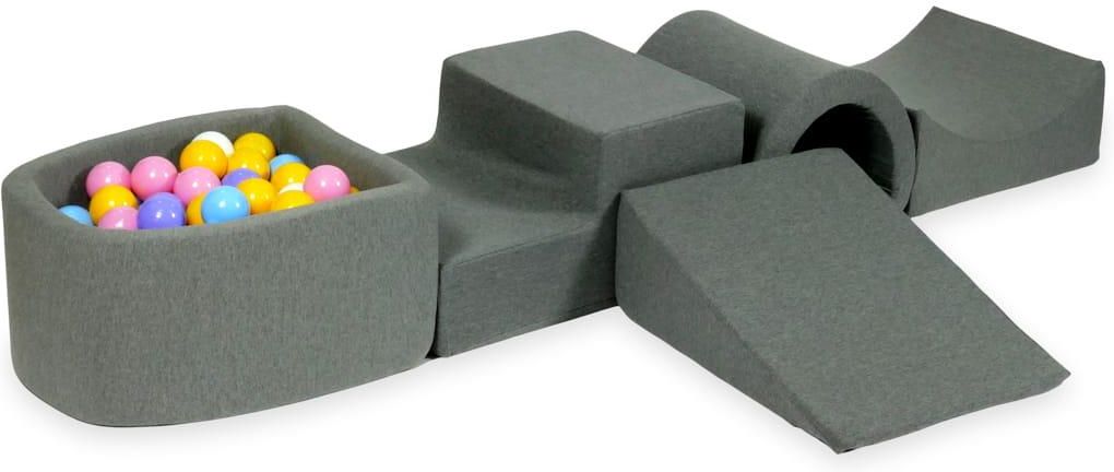 Mimii: Piankowy plac zabaw z mostkiem i z basenem micro szary + 100 piłek (jasny błękit, żółte, wrzos, pudrowy róż, białe)Piankowy plac zabaw lub jak inaczej nazywany jest - piankowy tor przeszkód to niezwykła frajda dla Twojego malucha. Właściwości: Pozytywnie wpływa na rozwój dziecka Idealnie nadaje się do zabawy (Tylko pod opieką osoby dorosłej) Niezwykła zabawa od pierwszych miesięcy życia Świetnie nadaje się na prezent!Dane techniczne: W całości wykonany z pianki Pokryty pokrowcem wykonanym z przyjemnej w dotyku tkaniny [95% bawełna, 5% elastan] Posiada certyfikat CE oraz certyfikat EN-71 Pokrowiec na zamek, zdejmowany do prania (prać w temperaturze 30 stopni Celsjusza) Produkty pakujemy próżniowo, aby zredukować wielkość paczek. (Po rozpakowaniu produkty potrzebują około 7 dni na osiągnięcie właściwego kształtu)Wymiary elementów (szerokość / długość / wysokość): Schodek: 45/60/30 cm Kołyska: 45/50/30 cm Klin: 45/60/20 cm Mostek: 45/40/30 cm Basen micro: 45/60/30 cm Plastikowe piłeczki do suchego basenu polski producent wykonane z nietoksycznego materiału, bezpieczne dla dzieci bardzo elastyczne, nie ulegają odkształceniu posiadają certyfikat CE średnica piłeczek 7 cmPole 'Plik' Możesz skorzystać z pola 'Plik' oraz załadować plik tekstowy lub graficzny, jeśli chcesz aby wewnątrz paczki znajdowała się wydrukowana kartka z informacją. Mogą to być życzenia lub informacja od kogo jest to prezent. Decyzję zostawiamy Tobie! (Załączanie plików nie jest obowiązkowe) Robimy krok w stronę ekologii! Jako jedni z nielicznych producentów zabawek piankowych wykorzystujemy piankę o podwyższonej gęstości. Dzięki temu, produkty z niej wykonane będą znacznie trwalsze, a co za tym idzie - będą dłużej służyły swoim małym właścicielom! Produkty pakujemy próżniowo, redukujemy dzięki temu wielkość paczek, a to z kolei bezpośrednio przekłada się na wiele korzyści. Dzięki zmniejszaniu wymiarów paczek, zredukowaliśmy również ilość ciężarówek potrzebnych do ich przewiezienia. Do jednej dziennie! Wszystkie kroki, które podjęliśmy przekładają się na mniejsze spalanie paliwa oraz mniejsze zanieczyszczanie środowiska. Uwaga! Kolory przedmiotów na zdjęciach mogą nieznacznie różnić się od rzeczywistych ze względu na różne ustawienia komputera i monitora.