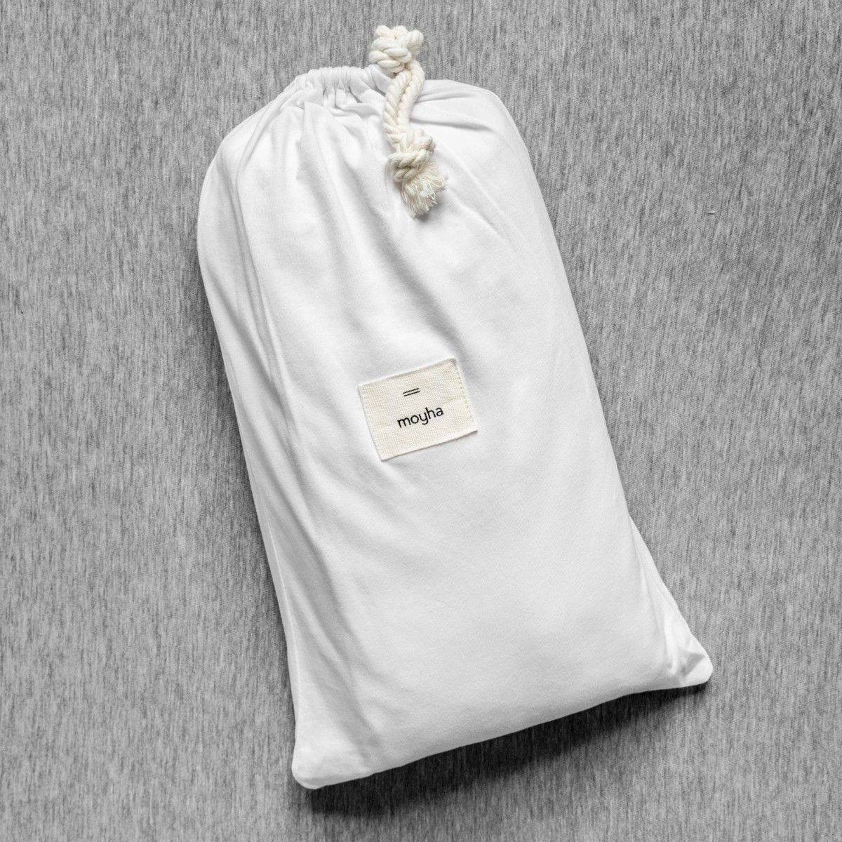 Prześcieradło Moyha białe Prześcieradło z gumką uszyte z wyjątkowo miękkiej i delikatnej dzianiny w śnieżnobiałym kolorze. Jej naturalny skład powoduje, że skóra oddycha, nie poci się, a prześcieradło jest przyjemne w dotyku, jak twój ukochany t-shirt. Pokochasz je od pierwszego dotyku. PS. Jeśli nie jesteś perfekcyjną panią domu i nie umiesz składać prześcieradła z gumką, nie przejmuj się, po praniu możesz je przechowywać w woreczku, w którym jest zapakowane. SKŁAD: 100% bawełna Maksymalna wysokość materaca 30 cm