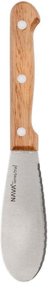STALOWY- Nóż do smarowania masła o długości19 cm. Długość ostrza wynosi 9 cm. Ostrze wykonane ze stali nierdzewnej a uchwyt wykonany z nitowanego drewna. WYGODNY- Posiada wygodną i odpowiednio wyprofilowaną rękojeść, która zapewni łatwość i komfort użytkowania. PRAKTYCZNY- Nóż posiada szeroką część ostrza, co zapewni szybkie i łatwe rozprowadzanieoraz rozsmarowanie np. masła.Ostrze jest dwustronne - z jednej strony powierzchnia jest gładka, z drugiej ząbkowana. UNIWERSALNY- Nóż można wykorzystać do smarowania masła, ale również do jego krojenia. Świetnie sprawdzi się do rozprowadzania smalcu, masła orzechowego, dżemu czy sera. PRZYDATNY- Przydatny zarówno w codziennym użytkowaniu jak również podczas organizacji przyjęć. Nadaje się do mycia w zmywarce do naczyń. Nóż do smarowania masła. Z jego pomocą w łatwy sposób rozprowadzisz masło, ale również dżem, masło orzechowe oraz smalec.Posiada dwustronneostrze, dzięki czemu przyda się do smarowania oraz krojenia. Duża powierzchnia ostrza zapewni wygodne smarowanie.Oryginalny produktgreckiej marki NAVA z liniiprzyborów kuchennych Terrestrial. Wyprodukowano zgodnie z europejskimi standardami.