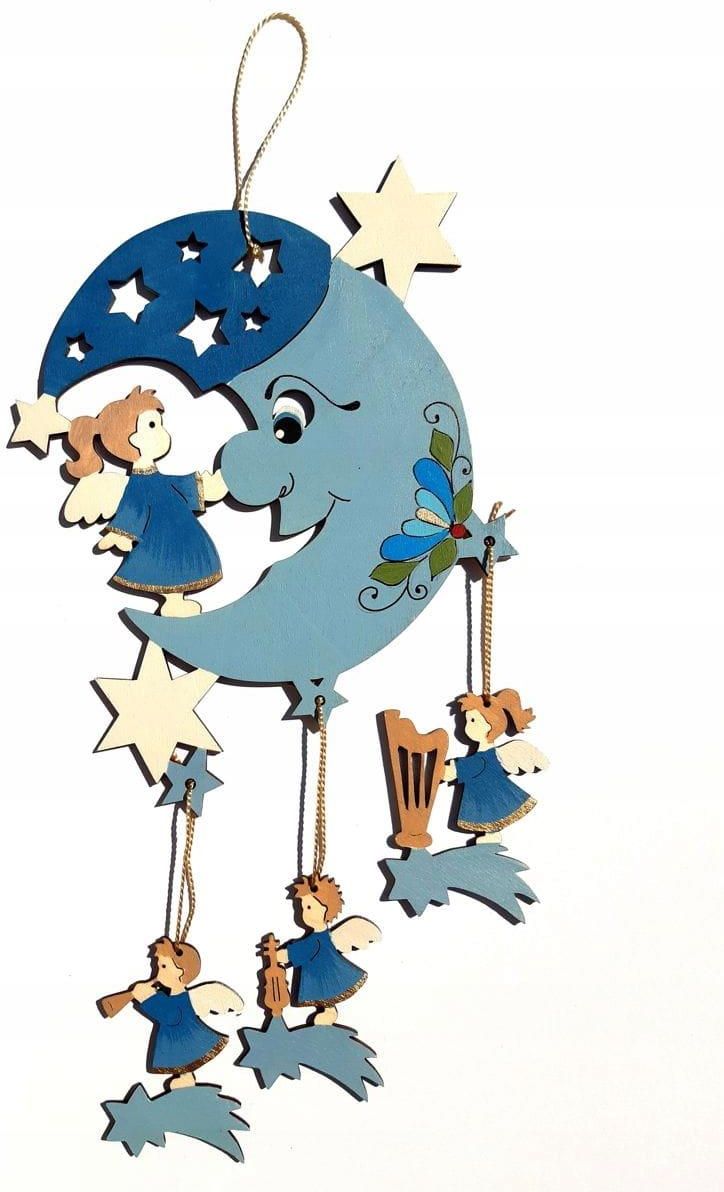 Zawieszka księżyc - ozdoba na ścianę (błękitna) Dziecięca ozdoba na ścianę (błękitna) - ręcznie malowana ozdoba ścienna do pokoju dziecięcego. W górnej części sznurkowa zawieszka. Wymiary: szerokość: około 17 cm wysokość: około 30 cm grubość sklejki: około 2 mm Wyprodukowano na Pomorzu.