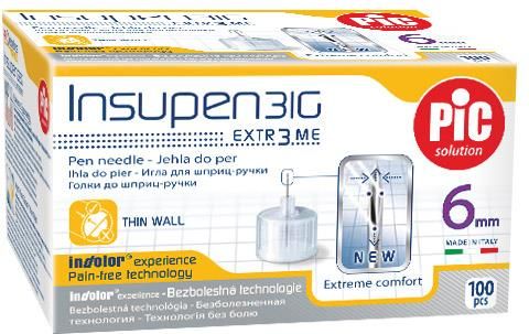 100 sztuk A New Therapy Sp.zo.o ul. Łucka 18 00-845 Warszawa *Igły Insupen są kompatybilne z następującymi penami: Amylin Pharmaceutical: Byetta 5 mcg, Byetta 10 mcg. Berlin Chemie: Berlin Pen Areo 2. Bioton: GensuPen. Lilly: KwikPen, HumaPen Memoir, HumaPen Savvio, HumaPen Luxura, HumaPen Luxura HD, Forsteo. Novo Nordisk: FlexPen, FlexTouch, Novopen3, Novopen 4, Novopen 5, Novopen Echo, Novopen Junior, Victoza Pen, InnoLet. Owen Mumford: AutoPen Classic 1-21, AutoPen Classic 2-42, AutoPen 24 1-21, AutoPen 24 2-42. Sanofi: ClickStar, SoloStar, Lyxumia Pen, JuniorStar, AllStar. Ypsomed: Ypsopen. Igły przeznaczone do penów insulinowych w celu podania insuliny lub hormonu wzrostu. Pikdare S.r.l. Via Saldarini Catelli 10 22070 Casnate con Bernate (CO) Włochy Supercienkie igły Pic Solution Insupen o wymiarach 0,23 mm x 6 mm to wysokiej jakości wyrób medyczny do penów insulinowych. Większa średnica wewnętrzna ścianek igły ułatwia przepływ insuliny i dzięki temu skrócony zostaje czas iniekcji. Trzykrotne ostrze ułatwia iniekcję i minimalizuje dyskomfort pacjenta. Specjalne pokrycie przeciwtarciowe, minimalizuje opór igły podczas wstrzykiwania. Końcówka igły od strony kartridża została wyprofilowana w specjalny sposób, aby zapobiegać fragmentacji membrany. Wysokiej jakości włoskie igły do penów insulinowych Insupen spełniają wymogi normy EN ISO 11608-2:2012 i są kompatybilne ze wszystkimi powszechnie dostępnymi penami*. sterylne, cienkościenne, jednorazowe, bez lateksu, wymiary: 0,23 mm x 6 mm. Produkt jednorazowego użytku. Przechowywać w suchym i chłodnym miejscu, w temperaturze -10-45°C, z dala od substancji chemicznych.