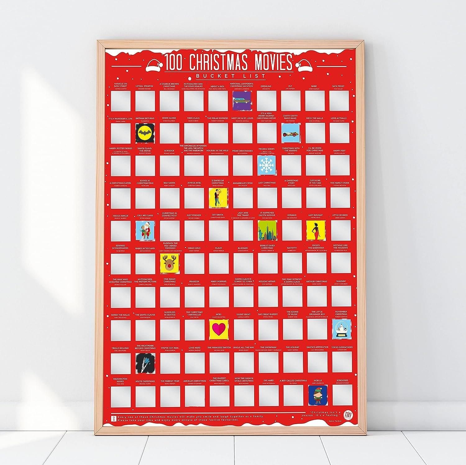 Plakat Zdrapka 100 filmów świątecznych 100 kultowych filmów na święta, które musisz obejrzeć przed śmiercią lub najbliższymi świętami 100 tytułów filmów oraz grafik, które są ukryte pod zdrapką Plakat w języku angielskim Wymiary: 42 x 59.4 cm Eleganckie opakowanie – tuba Doskonały pomysł na prezent na Mikołajki Świetny gadżet dla świątecznego maniaka Podejmij wyzwanie i obejrzyj wszystkie 100 pozycji z listy