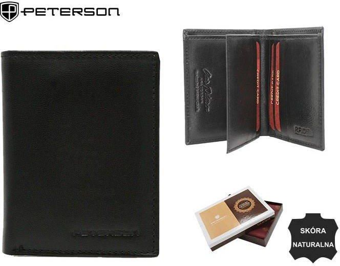 Mały, skórzany portfel damski bez zapięcia — Peterson Jakość i precyzja wykonania | Uszyty z wysokogatunkowej skóry naturalnej; Klasyczny design| Portfel o klasycznej stylistyce. Model w orientacji pionowej bez zapięcia zewnętrznego; Praktyczny dodatek | Funkcjonalne etui na karty i dokumenty o standardowym formacie. Posiada także przegrodę na banknoty; Bezpieczeństwo na wysokim poziomie | Wyposażony w technologię RFID BLOCKING SYSTEM, która zabezpiecza karty zbliżeniowe, dokumenty biometryczne, legitymacje i karty komunikacji miejskiej przed nieautoryzowanym odczytem danych. Rozbudowane wnętrze W portfelu mieści się: 12 przegródek dedykowanych na karty, wizytówki lub dokumenty o standardowym formacie (w tym jedna kieszeń transparentna); 1przegroda na banknoty wyszyta po całej szerokości portfela. Portfel nie posiada kieszeni na bilon. ❗