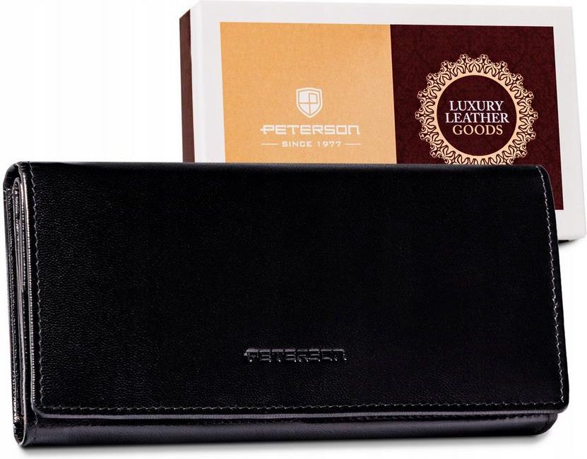 Portfel damski ze skóry naturalnej na zatrzask — Peterson Produkt najwyższej jakości | Odszyty bardzo trwale z doskonałej jakości skóry naturalnej o gładkiej fakturze; Ponadczasowy dodatek | Portfel o klasycznej stylistyce. Model w orientacji poziomej, zapinany bezpiecznym i trwałym zatrzaskiem; Pomieści wszystkie Twoje karty i dokumenty | Portfel będzie dla Ciebie idealny, jeżeli na co dzień nosisz dokumenty w dużym formacie jak np. dowód rejestracyjny. Ponadto zmieścisz w nim pokaźne ilości kart oraz gotówki; Bezpieczeństwo na najwyższym poziomie| Wyposażony w technologię RFID BLOCKING SYSTEM, która zabezpiecza karty zbliżeniowe, dokumenty biometryczne, legitymacje i karty komunikacji miejskiej przed nieautoryzowanym odczytem danych. Uporządkuj swoje karty i dokumenty W wyposażeniu portfela: aż 12 przegródek dedykowanych na karty, wizytówki lub dokumenty w standardowym formacie; trzy z nich są przezroczyste; 2 kieszonki na dokumenty w większym formacie, jak dowód rejestracyjny w okładce; 1 schowek w centralnej części zapinany na suwak. Przegródki na karty i dokumenty też zabezpieczono podszewką. Pozwala to uniknąć otarć na skórze, podczas wkładania i wyjmowania kart. Mnóstwo miejsca na gotówkę Portfel jest bardzo pojemny. Kieszenie na banknoty i monety są odpowiednio duże, aby pomieścić pokaźne ilości pieniędzy. bilon możesz schować do 2 wewnętrznych kieszeni. Jedna z kieszeni zapinana jest na suwak, druga klapką na zatrzask; banknoty zmieścisz w 2 pojemne, otwarte przegródki.