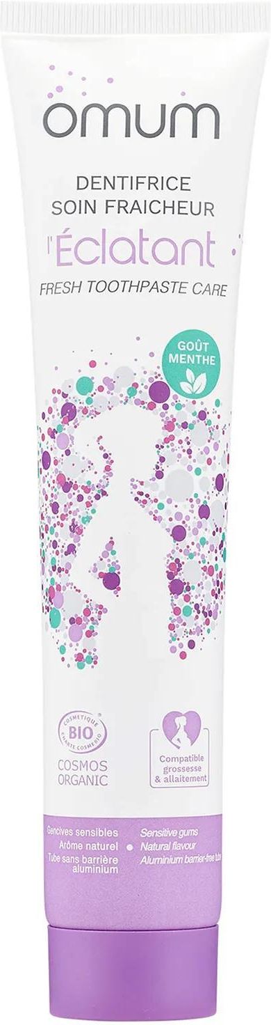 Naturalna pasta do wrażliwych zębów i dziąseł, bez fluoru, dla kobiet w ciąży i karmiących, BLASK, Cosmebio, 75 ml, Omum Cosmebio: TAK Cosmos Organic: TAK EcoCert: TAK Produkt Naturalny: TAK Kraj pochodzenia: Francja Testowany dermatologicznie: TAK Odpowiednie dla wegan: TAK Cruelty Free & Vegan by PETA: TAK Slow Cosmetics: TAK Naturalna pasta do wrażliwych zębów i dziąseł, bez fluoru, dla kobiet w ciąży i karmiących, BLASK, Cosmebio, 75 ml, Omum Naturalna pasta do wrażliwych zębów i dziąseł, bez fluoru, dla kobiet w ciąży i karmiących, BLASK, Cosmebio, 75 ml, Omum Ekologiczna, ultraświeża, bezfluorowa pasta do zębów idealna dla wrażliwych zębów i dziąseł. To kosmetyk dla całej rodziny, szczególnie odpowiedni dla kobiet w ciąży, karmiących piersią oraz dzieci od 3. roku życia. Pomaga utrzymać higienę jamy ustnej, zapewnia natychmiastowy świeży oddech i uczucie czystości! Jej naturalny, miętowy i niezbyt intensywny aromat jest dostosowany do wrażliwości kobiet w czasie ciąży i karmienia piersią. Zawiera proszek z liści aloesu, który chroni i oczyszcza dziąsła. Perlit, czyli szkło wulkaniczne, dzięki swojemu działaniu mikrozłuszczającemu, usuwa płytkę nazębną, a przy tym szanuje szkliwo i dziąsła. Bez dwutlenku tytanu. Pasta w 100% kompatybilna z ciążą i karmieniem piersią. Kosmetyk wegański, ekologiczny, certyfikowany przez Cosmebio, Ecocert Greenlife zgodnie ze standardem Ecocert oraz Slow Cosmétique. POTWIERDZONE BEZPIECZEŃSTWO Niezależne laboratorium potwierdziło bezpieczeństwo kosmetyku dla kobiet w ciąży (już od 1. miesiąca) i karmiących piersią. Odpowiedni także dla dzieci od 3. roku życia POTWIERDZONA SKUTECZNOŚĆ Skuteczność kosmetyku została potwierdzona w badaniach* Zapewnia uczucie świeżości: 70% Szanuje wrażliwe zęby: 80% Ma przyjemny smak: 75% * Test satysfakcji przeprowadzony na 20 kobietach po 14 dniach stosowania przez niezależne laboratorium Pielęgnacja zębów i dziąseł w czasie ciąży Wahania hormonalne w czasie ciąży uwrażliwiają dziąsła. Mogą stać się wówczas zaczerwienione, opuchnięte i podatne na krwawienie. Jeśli te symptomy się pojawią, mamy do czynienia z ciążowym zapaleniem dziąseł. Zapalenie dziąseł jest częstym zjawiskiem w czasie ciąży i dotyka głównie kobiety w ciąży pomiędzy 3. a 9. miesiącem ciąży. Na szczęście te zmiany często znikają po porodzie. Jak uchronić się przed tymi problemami? Należy wybrać pastę do zębów przeznaczoną dla kobiet w ciąży, która będzie odpowiednia dla wrażliwych dziąseł. Szczotkowanie powinno być delikatniejsze i dokładniejsze. Pamiętaj, że zdrowie jamy ustnej w czasie ciąży jest ważne, dlatego nie wahaj się skontaktować z dentystą, jeśli masz taką potrzebę. Sposób użycia Szczotkuj zęby i dziąsła po każdym posiłku przez dwie lub trzy minuty, wykonując okrężne ruchy. INCI AQUA, SORBITOL, GLYCERIN**, PERLITE, MALTITOL, MANNITOL, XANTHAN GUM, SODIUM COCO-SULFATE, PARFUM, ALOE BARBADENSIS LEAF POWDER*, MICROCRYSTALLINE CELLULOSE, CELLULOSE GUM * składniki pochodzące z kontrolowanych upraw ekologicznych ** wytworzone ze składników organicznych 44% składników pochodzi z rolnictwa ekologicznego. 99% składników jest pochodzenia naturalnego.