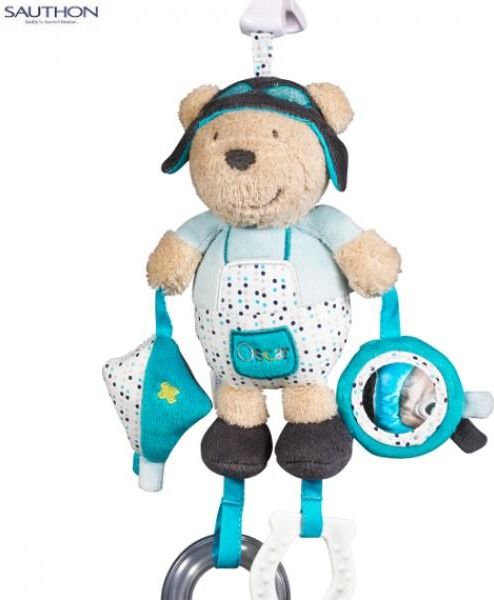 Zabawka do powieszenia Lazare marki Sauthon to sympatycznie wyglądający miś Pilot, który będzie zachęcał dziecko do zabawy. Zabawka posiada kółka i grzechotkę.Zabawka z klipsem do mocowania. Zabawka pochodzi z kolekcji Lazare, w której znajduje się wiele innych zabawek dla niemowląt i dodatków do pokoju dziecięcego.Wymiary:długość 35 cm