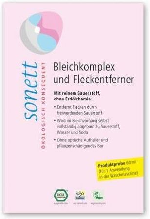 SONETT Ekologiczny wybielacz / odplamiacz 60 ml Dostępny w opakowaniach: 60 ml, 0,45 kg, 0,9 kg, 5 kg Moduł 3 w MODUŁOWYM SYSTEMIE PRANIA SONETT Z czystym tlenem, bez surowców petrochemicznych do usuwania plam i przebarwień z tkanin białych i o trwałych kolorach do usuwania wszystkich dających się …