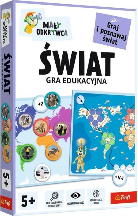 Trefl Świat Mały Odkrywca 02807 Gra edukacyjna Świat Świat to gra edukacyjna, która zabiera dzieci w podróż po najdalszych zakątkach globu. Dzięki różnorodnym wariantom rozgrywki, mali odkrywcy poznają zwierzęta, zabytki i charakterystyczne elementy wszystkich kontynentów.  Gra wspiera …