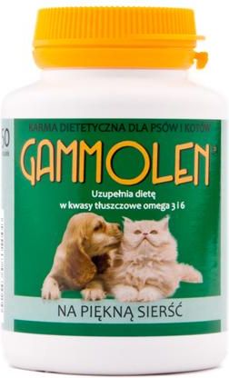 GAMMOLEN Preparat poprawiający skórę i sierść 60 tab. – uzupełniająca karma dietetyczna dla psów i kotów Gammolen to niezwykły preparat, który ma dobroczynny wpływ na stan skóry i sierści zwierząt domowych. Jest polecany psom i kotom, u których można zaobserwować nadmierne linienie, łamliwość włosków oraz miejscowe łysienie. Skład produktu bazuje na dobroczynnych wielonienasyconych kwasach tłuszczowych omega-3 i omega-6. Uzupełnienie niedoboru cennych substancji znacząco poprawia stan skóry, która staje się elastyczna, gładka i nie powoduje przykrego uczucia swędzenia. Regularne podawanie preparatu pomaga Twoim pupilom w wyraźnym zagęszczeniu sierści i hamuje jej wypadanie. Miłe w dotyku lśniące futro jest doskonałą wizytówką zwierzęcia prezentowanego na wystawach, a także podczas zwykłych, codziennych spacerów. Producent zadbał, aby aplikowanie prozdrowotnej zawartości nie nastręczało problemów nawet początkującym właścicielom zwierząt. W razie potrzeby kapsułki możesz wycisnąć bezpośrednio do karmy. Duże opakowanie umożliwia przeprowadzenie podstawowej kuracji uzupełniającej niedobory kwasów omega. Zastosowanie: GAMMOLEN preparat na sierść dla kotów i psów: zmniejsza wypadanie sierści oraz poprawia stan skóry i wygląd sierści. Zawiera omega 3 i omega 6 w proporcjach specjalnie dostosowanych do organizmu psów i kotów. Forma kapsułki zapewnia aktywność składników i jest łatwa do podania. Składnikiem czynnym Gammolenu są WNKT omega-6 i omega-3. Jedna kapsułka Gammolenu zawiera 119,8 mg NNKT omega-6 pochodzących z oleju z ogórecznika lekarskiego oraz 72,5 mg NNKT omega-3 pochodzących z oleju z lnu. Zawarte w Gammolenie WNKT omega-3 pochodzą ze specjalnej złocistej odmiany lnu, która zawiera aż 50% najważniejszego przedstawiciela omega-3 (kwas alfalinolenowy).Pierwsze efekty są widoczne już po 2 tygodniach stosowania. Wskazania: - Preparat zalecany dla psów z problemami skórnymi, o matowej, suchej i łamliwej sierści a także w okresie linienia. - Sierść kota jest sucha, matowa i łamliwa, kiedy kot się drapie, lub kiedy ma miejscowe wyłysienia.- Zimą, kiedy kot i pies długo przebywa w suchym, ogrzewanym pomieszczeniu, a na zewnątrz chodzi po zmarzniętym śniegu.- kot lub pies jest w wieku rozwojowym lub podeszłym, a także:• aby pomóc zwierzęciu łagodniej przejść przez okres linienia,• aby uzyskać wspaniałą sierść w przygotowaniu do wystawy,• profilaktycznie. Dawkowanie: Dla psa zwykle 1 kapsułka / 5 kg wagi dziennie. Dla kota - 1 kapsułka dziennie. Najlepiej podawać Gammolen w trakcie lub bezpośrednio po jedzeniu. Można wycisnąć zawartość kapsułki bezpośrednio do pokarmu. Kuracja podstawowa powinna trwać nie krócej niż 2 miesiące, aby organizm mógł uzupełnić niedobór kwasów omega-6 i omega-3. Jedna kapsułka preparatu zawiera: 100% tłuszcze (w tym: 15% kwasy nasycone, 33% WNKT jedno i dwunienasycone, 32% WNKT Omega-6, 20% WNKT Omega-3) Opakowanie: 60 kapsułek