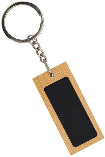 Bambusowy brelok, ozdobiony czarną, metalową płytką umożliwiającą wykonanie laserowego logo w błyszczącym, srebrnym kolorze.