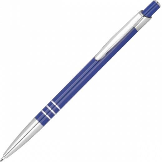 Smukły długopis, wykonany z aluminium pochodzącego z recyklingu, z niebieskim wkładem.