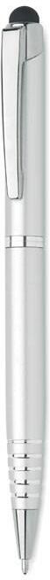 Długopis z rysikiem do ekranu Stan: Nowy Wymiary (cm): Ø1 x 13,9 cm Waga (kg): 0,017 Kolory: Srebrny Materiał: Aluminium Obrotowy długopis z aluminium pochodzącego z recyklingu z rysikiem do ekranów touch pen. Niebieski tusz.