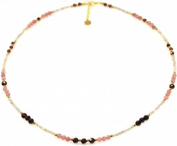 Naszyjnik wykonana ze srebra próby 925, pozłacanego 24 karatowym złotem. Kamień: Turmalin+ Hematyt+ Granat+ Labladoryt Rozmiar kamienia: 2 mm/4mm/3mm Długość: 44 cm Długości do wyboru: 38 cm /42 cm/ 44 cm Zapięcie: klasyczne (federing) Biżuteria ręcznie wykonana, produkt Polski.