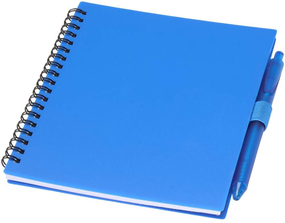 Notatnik z miękką okładką Niove wykonany z tworzyw sztucznych pochodzących z recyklingu i zawierający 70 kartek w kropki o gramaturze 70 g/m². Notatnik ma ostre rogi i wsuwkę na długopis. Rozmiar notatnika: 140 x 178 mm. Długopis również jest wykonany z plastiku pochodzącego z recyklingu. Kolor tuszu: Niebieski. Wydajność: 800 metrów. Grubość linii: 1,0 mm.
