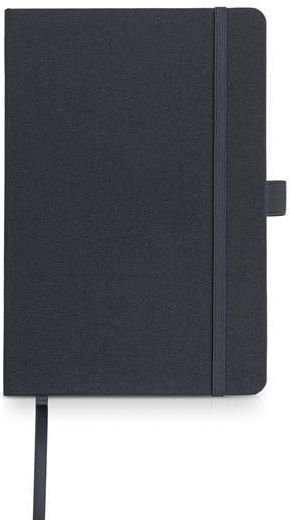Notes A5 z RPET z gumką na długopis, posiada twardą okładkę 160 białych stron i certyfikat FSC
