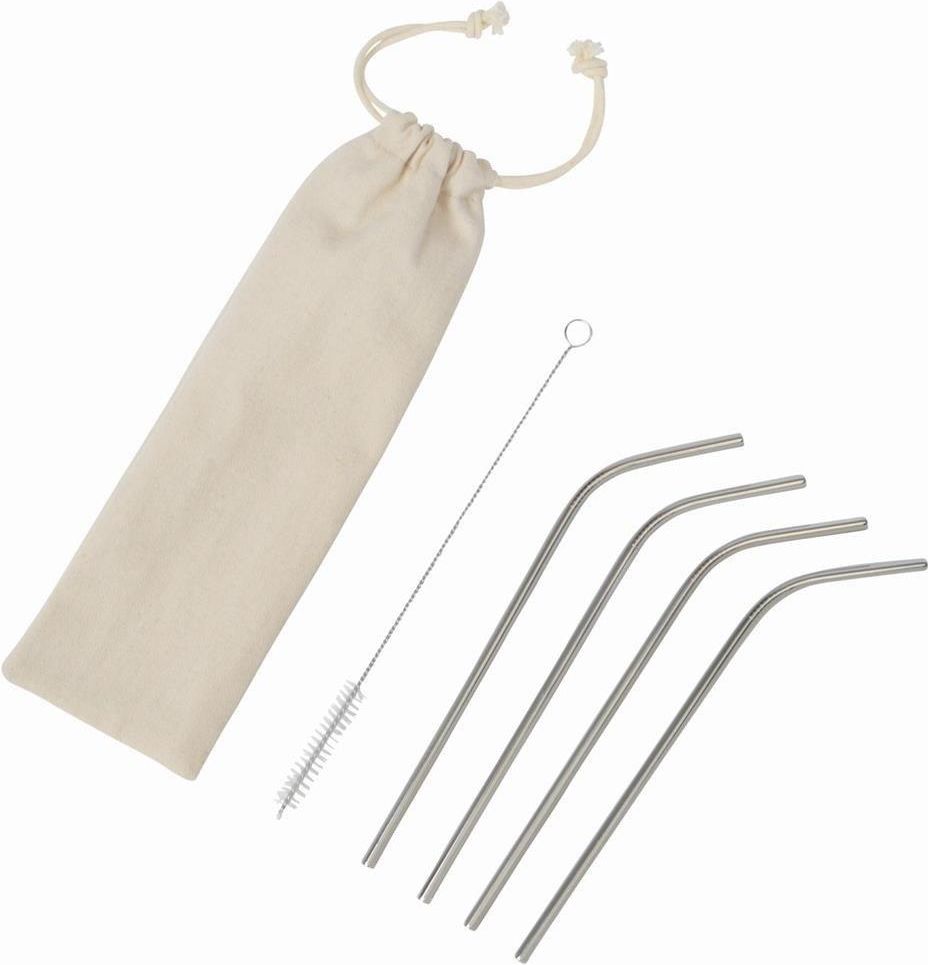 Zestaw słomek ze stali nierdzewnej DRINK HAPPY wykonany z 4 wygiętych słomek i szczoteczki do łatwego czyszczenia, w przyjaznej dla środowiska bawełnianej torbie.