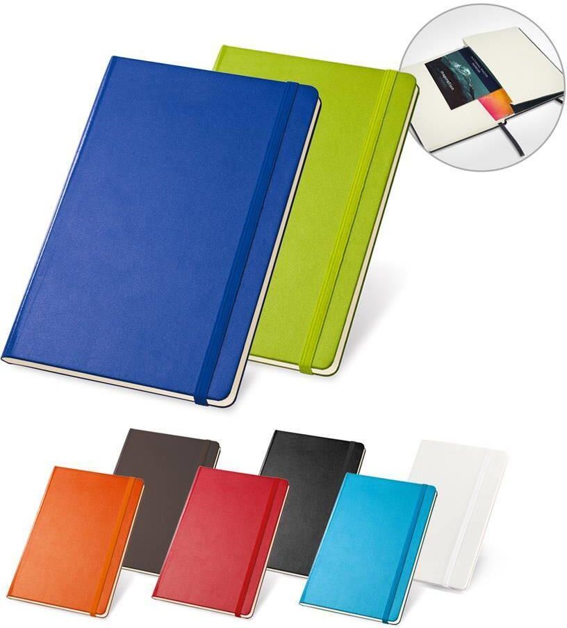 Notatnik A5 ze 160 stronami w linie w kolorze kości słoniowej. Zawiera twardą okładkę, wewnętrzną kieszeń, pasek oddzielający i elastyczną opaskę. 137 x 210 mm