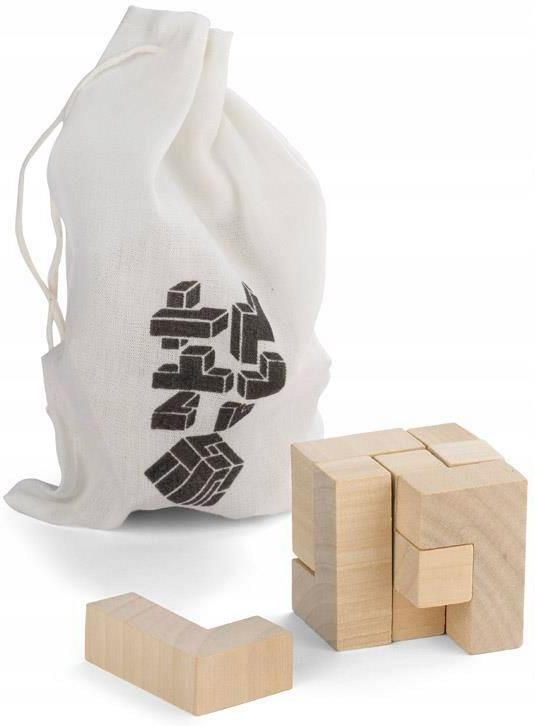 Układanka CUBE 20088 Beżowy Stan: Nowy Materiał: Bawełna, drewno Wymiary (cm): 45 x 45 x 45 mm Kolory: Beżowy Mała układanka logiczna w bawełnianym woreczku. Układanka wykonana z drewna. Logo nadrukowujemy na woreczek metodą sitodruku.