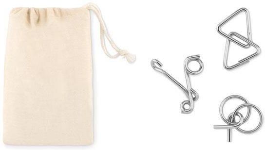 Zestaw 3 łamigłówek z metalu zapakowanych w bawełniany woreczek.