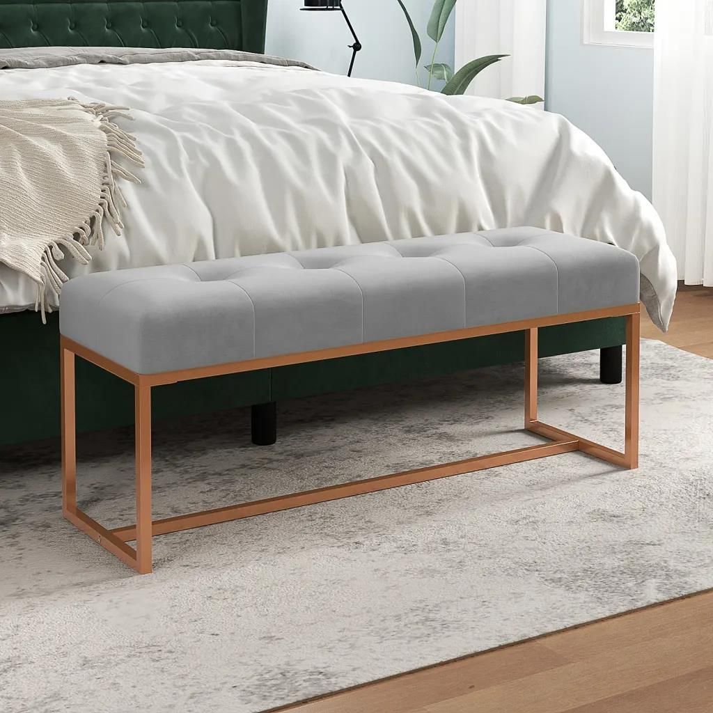 Ta ławka będzie przyciągającym wzrok elementem, zapewniając jednocześnie dodatkowe miejsce do siedzenia w Twojej przestrzeni. Miękka tkanina: aksamit to miękki, luksusowy materiał, który charakteryzuje się zwartymi, równo przyciętymi włóknami i gładkością. Aksamit wyróżnia się miękkością, dzięki czemu jest przyjemny w dotyku. Wielofunkcyjna ławka: ta ławka może służyć jako dodatkowe miejsce do siedzenia w Twoim domu. Może być również używana jako ławka przy łóżku. Wygodne siedzisko: ta ławka jest wyściełana pianką, co zapewnia dodatkowy komfort podczas siedzenia. Uwaga: Każdy produkt jest dostarczany wraz z instrukcją montażu dla ułatwienia tej czynności. Kolor: szary Materiał: aksamit (100% poliester), metal, materiał drewnopochodny Materiał wypełnienia: gąbka Wymiary: 110 x 36 x 45 cm (szer. x gł. x wys.)
