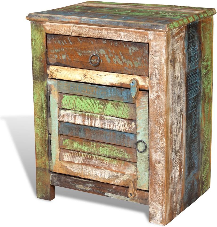 Ta drewniana szafka zapewnia przestrzeń do przechowywania i poukładania Twoich rzeczy. Na jej mocnym blacie możesz postawić lampkę, kosmetyki lub dekoracje. Szafka wykonana została z odzyskanego drewna, co sprawia że każdy egzemplarz jest unikatowy i nieco inny od poprzedniego. Meble wykonane z odzyskanego materiału posiadają cechy charakterystyczne różnych rodzajów drewna, takich jak drewno tekowe, mango, akacja, saal itp. Odzyskane drewno jest solidne, stabilne, trwałe i piękne. Dziury po gwoździach oraz widoczna struktura pokazują jego historię i zapraszają młodsze pokolenia do jej zgłębienia. Mebel ten postawiony w domu pokaże zamiłowanie właściciela do dbałości o środowisko i zasoby naturalne. Ręczne wykonanie dodaje meblowi styl vintage i egzotyczny charakter. Każdy element procesu: łączenie, polerowanie, malowanie i woskowanie został starannie przeprowadzony. Stolik ten będzie świetnym dodatkiem do Twojego domu. Ważna uwaga: ze względu na to, że każdy egzemplarz jest ręcznie wykonany z unikatowych elementów drewna, stoliki różnią się między sobą kolorystycznie. Przesyłka odbywa się losowo. Materiał: lite drewno odzyskane Wymiary całkowite: 45 x 33 x 55 cm (dł. x szer. x wys.) Wymiary szuflady: 32,5 x 27,5 x 8,5 cm (dł. x szer. x wys.) Wymiary przegrody (szafki poniżej): 32,5 x 30 x 28 cm (dł. x szer. x wys.) Drewno w różnych kolorach i żelazne uchwyty W pełni ręczne wykonanie Produkt szlifowany, częściowo malowany i woskowany