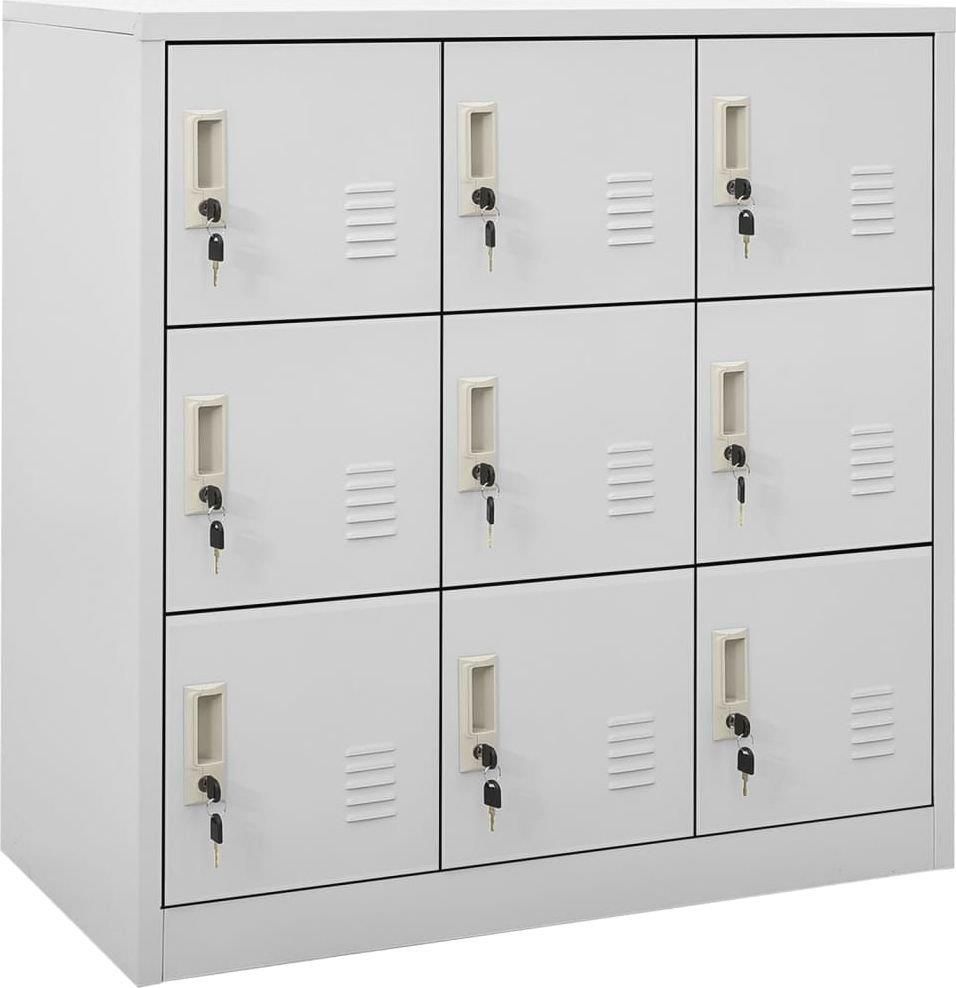 Szafka zamykana na klucz prezentuje nowoczesny design, dzięki czemu będzie znakomitym dodatkiem dekoracyjnym do dowolnego pokoju lub przestrzeni biurowej. Szafkę wykonano ze stali, dzięki czemu jest trwała i łatwa do czyszczenia. Zawiera ona zamykane przegrody i oferuje mnóstwo miejsca na Twoje rzeczy, takie jak ubrania, buty, torebki, książki, dokumenty itp. Mebel ten sprawdzi się w szkołach i biurach do przechowywania różnych przedmiotów. Kolor: jasnoszary Materiał: stal Wymiary: 90 x 45 x 92,5 cm (szer. x gł. x wys.) 9 przegród Z zamkami Maksymalne obciążenie (na półkę): 10 kg Maksymalne obciążenie całkowite: 90 kg Wymagany montaż: tak OSTRZEŻENIE: aby zapobiec przewróceniu się produktu, należy przymocować go do ściany za pomocą dołączonego elementu.