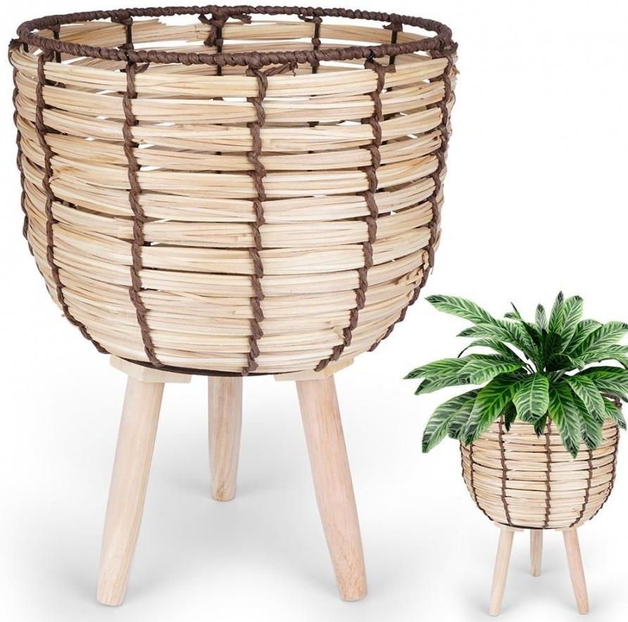 EFEKTOWNA - Duża osłonka na doniczkę na nóżkach. Wymiar zewnętrzny doniczki na nóżkach: 26,5 x 36 cm. Doniczka ma wysokość 19 cm i średnicę 26,5 cm. Do osłonki zmieści się doniczka o dolnej średnicy max. 17 cm. DREWNIANA - Wykonana z drewna w formie plecionego koszyka. Usadowiona jest na trzech drewnianych nóżkach. STABILNA - Osłonka jest stabilna dzięki trzem nóżkom, które są do niej przymocowane. UNIWERSALNY - Osłonka na doniczkę pozwoli nam wyeksponować ulubione rośliny zarówno żywe jak i sztuczne. Będzie stanowić idealne połączenie z innymi dekoracjami. STYL BOHO - Osłonka utrzymana w modnym stylu boho. Klasyczny design osłonki nada wyjątkowego charakteru każdemu wnętrzu. Naturalne kolory drewna będą pięknie komponować się z zielenią kwiatów. Idealny do domu, biura, ale również na zadaszony balkon lub taras. Osłonka na doniczkę na trzech nóżkach. Posiada dużą powierzchnię do przechowywania roślin. Niezwykle efektowna dzięki dopracowanemu wykonaniu. Wyjątkowy element dekoracyjny do domu oraz ogrodu. Doskonale komponuje się z wszelką roślinnością. Idealna do stworzenia magicznej przestrzeni pełnej kwiatów lub ziółek, zarówno na balkonie jak i na tarasie. Dzięki neutralnym kolorom będzie pasowała do każdego wnętrza i będzie stanowiła piękny element dekoracyjny. Oryginalny produkt marki Vilde. Wyprodukowano zgodnie z europejskimi standardami.