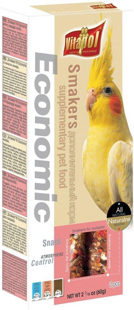 Smakers® Economic stanowi urozmaicenie codziennej diety papug. Mieszanka drobnych ziaren trzech rodzajów prosa została wzbogacona o chętnie zjadane, lekkostrawne płatki pszenne. Są one cennym źródłem błonnika, który działa pozytywnie na układ pokarmowy i wspomaga procesy trawienia.Niewielki udział rodzynek poprawia smakowitość pokarmu, bowiem są one chętnie zjadane przez ptaki. Mieszanka paszowa uzupełniająca. Skład: proso żółte, proso białe, proso czerwone, kanar, płatki pszenne, krokosz, sorgo białe, sorgo czerwone, siemię lniane, owies bezłuskowy, marchew prażona, słonecznik pasiak, murzynek, rodzynki, mąka pszenna, mąka kukurydziana, mączka z lucerny, sproszkowany anyż, karoten. Składniki analityczne: białko surowe (ozn. Met. Kjeldahla) min. 9,1%, tłuszcz surowy. 3,4%, włókno surowe max. 9,94%, popiół surowy max. 3,6%, wilgotność max. 12%. Podawać jako uzupełnienie codziennej diety.