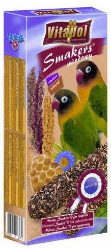 SMAKERS DLA NIEROZŁĄCZEK -MIODOWY 90G ZVP-2607 VITAPOL idealnie uzupełnia codzienną dietę ptaków z dodatkiem pyłku kwiatowego wspierającego układ odpornościowy w 80% wykonywane ręcznie poddawane niepowtarzalnemu na rynku procesowi suszenia w temperaturach nie przekraczających 65ºC przez kilka godzin. Brak stosowania wysokich temperatur umożliwia zachowanie większej ilości witamin i związków mineralnych ulegających rozpadowi w przypadku stosowania innych metod suszenia, jak np. wypiek. Smakers, którego skład został wzbogacony odżywczym miodem przez co jest jednym z ulubionych smakołyków. Miód prócz walorów smakowych i odżywczych charakteryzuje się właściwościami leczniczymi i wzmacniającymi odporność organizmu. Z powodzeniem można go podawać zarówno zdrowym jak i chorym lub osłabionym papugom. Dawkowanie : podawać codziennie Skład : proso żółte, sorgo czerwone, nasiona mozgi kanaryjskiej, proso czerwone, sorgo białe, nasiona nigru, siemię lniane, nasiona konopi, gryka, mąka z ziarna pszenicy. Zawartość składników analitycznych białko surowe % (min) : 13 oleje i tłuszcze surowe % (min) : 3,9 włókno surowe % (max) : 9,5 popiół surowy % (max) : 4,9 wilgotność % (max) : 12